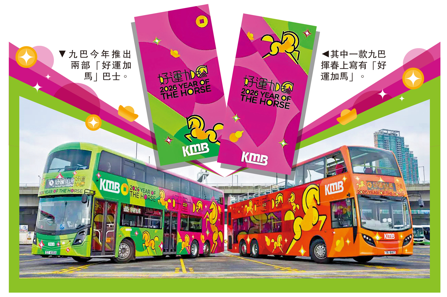 九巴今年推出兩部「好運加馬」丙午馬年生肖巴士,其中傳統雙層巴士以綠色和粉紅色作主色,發言人指「帶出春回大地的感覺」,而車身上以半圓等幾何圖案砌成的金馬,就猶如在綠草上奔馳;而首次擔任生肖巴士的開篷巴士,則以傳統代表喜慶的紅、橙二色作主調。金馬駿馬奔騰的形態生動活潑,兩者均配以金錢、元寶等作點綴,寓意瑞馬迎春,金馬納福。至於馬年揮春上寫上「好運加馬」、「喜氣盈門」,祝願市民新一年運氣和歡樂齊來!
