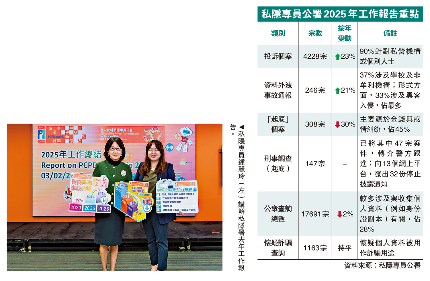 公署總結去年工作,去年接獲4228宗投訴,按年上升23%;至於資料外洩事故通報,全年錄得246宗,當中79宗來自公營機構,167宗來自私營機構,主要涉及黑客入侵、遺失文件或便攜式裝置等;此外,公署去年合共處理308宗「起底」個案,按年減少30%,主要牽涉金錢或家人及感情糾紛,政見糾紛只佔1.3%,整體數字創下「起底」刑事化條文實施四年以來新低。