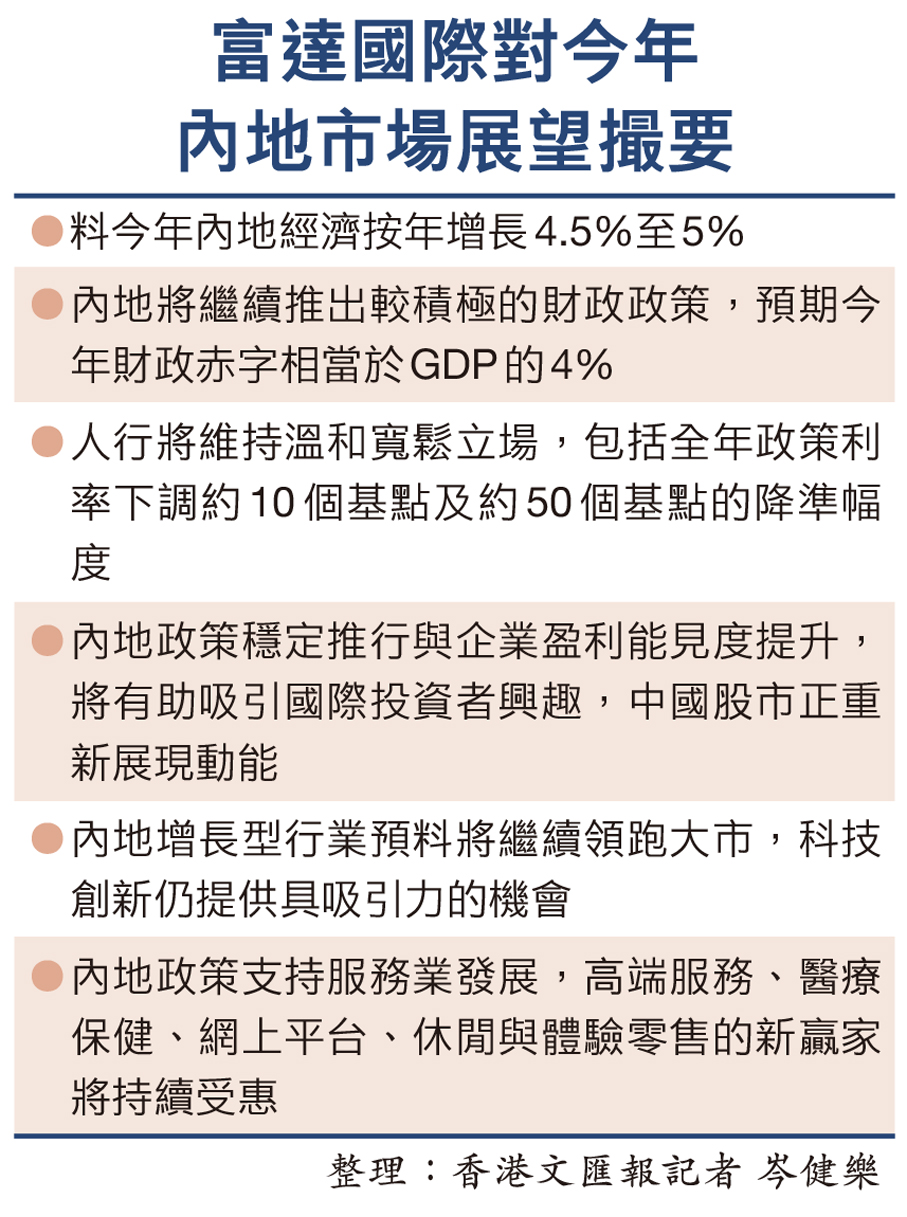 為支持內地經濟增長,劉培乾預期中央政府將繼續推出較積極的財政政策,預期今年財政赤字相當於GDP的4%,而地方政府專項債或輕微提高,藉以支持基建開支。另外,她預期中國人民銀行將維持溫和寬鬆立場,包括全年政策利率下調約10個基點及約50個基點的降準幅度。鑑於通脹壓力溫和、經濟增長仍偏軟,中國人民銀行可能採取循序漸進的寬鬆政策,在增長、匯率、就業及保障銀行淨息差之間取得平衡。她續指,如果年內美聯儲多次減息,中國人民銀行將有更大空間放寬貨幣政策支持內地經濟增長。