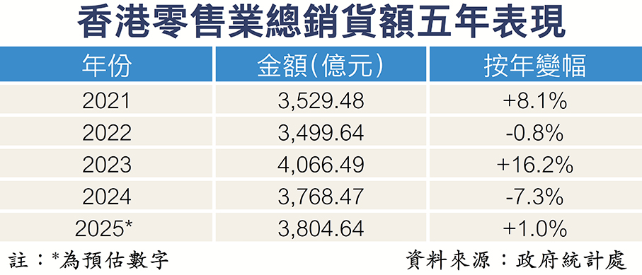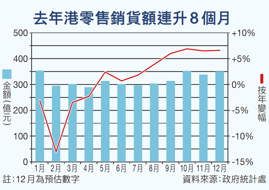 香港零售業持續回暖,特區政府統計處周二(3日)公布的最新去年12月零售業總銷貨值按年升6.6%至350億元,是連續8個月上升,並連續4個月保持達6%或以上的增幅,2025年全年零售業總銷貨值,政府初步估計將按年升1%至3,804.64億元,扭轉2024年大跌7.3%的頹勢。德勤中國昨日預料,在樓市回穩、股市暢旺及人民幣走強等多項利好因素帶動下,今年本港零售業將繼續增長,零售業總銷貨值有望增長近8%至約4,100億元,珠寶首飾等奢侈品類別有望上升19%。該行看好訪港旅客將繼續推動奢侈品、電子消費品、藥物及化妝品等領域消費,建議特區政府進一步深化並拓展盛事經濟發展,以吸引更多旅客並延長留港時間。