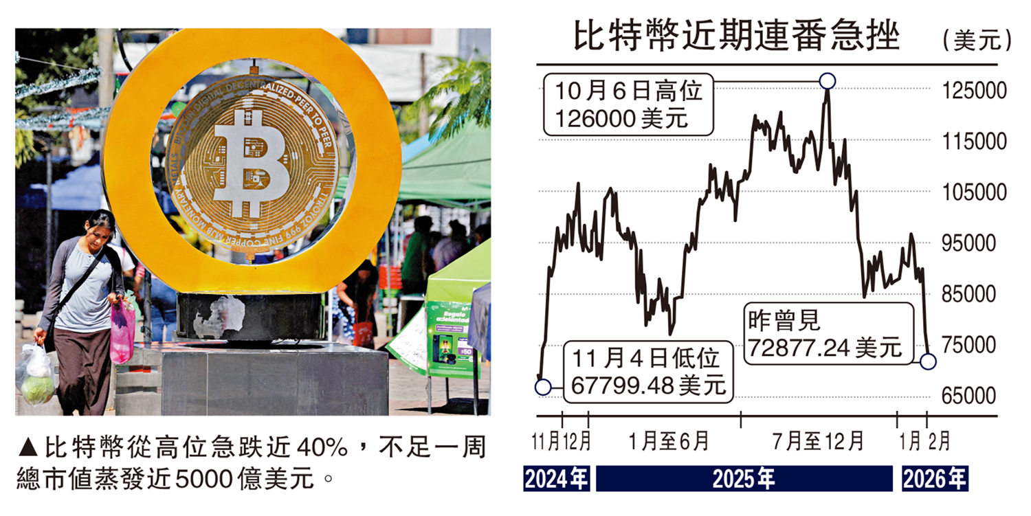 【大公報訊】全球最大加密貨幣比特幣近期持續重挫,周三一度跌破7.3萬美元,較歷史高位下跌近40%,為美國總統特朗普於2024年11月再入主白宮以來的最低點。此輪跌勢令加密貨幣總市值在不足一周內蒸發近5000億美元。曾準確預測2008年金融危機的著名投資者Michael Burry警告,比特幣的暴跌可能加劇成為自我強化的「死亡螺旋」。