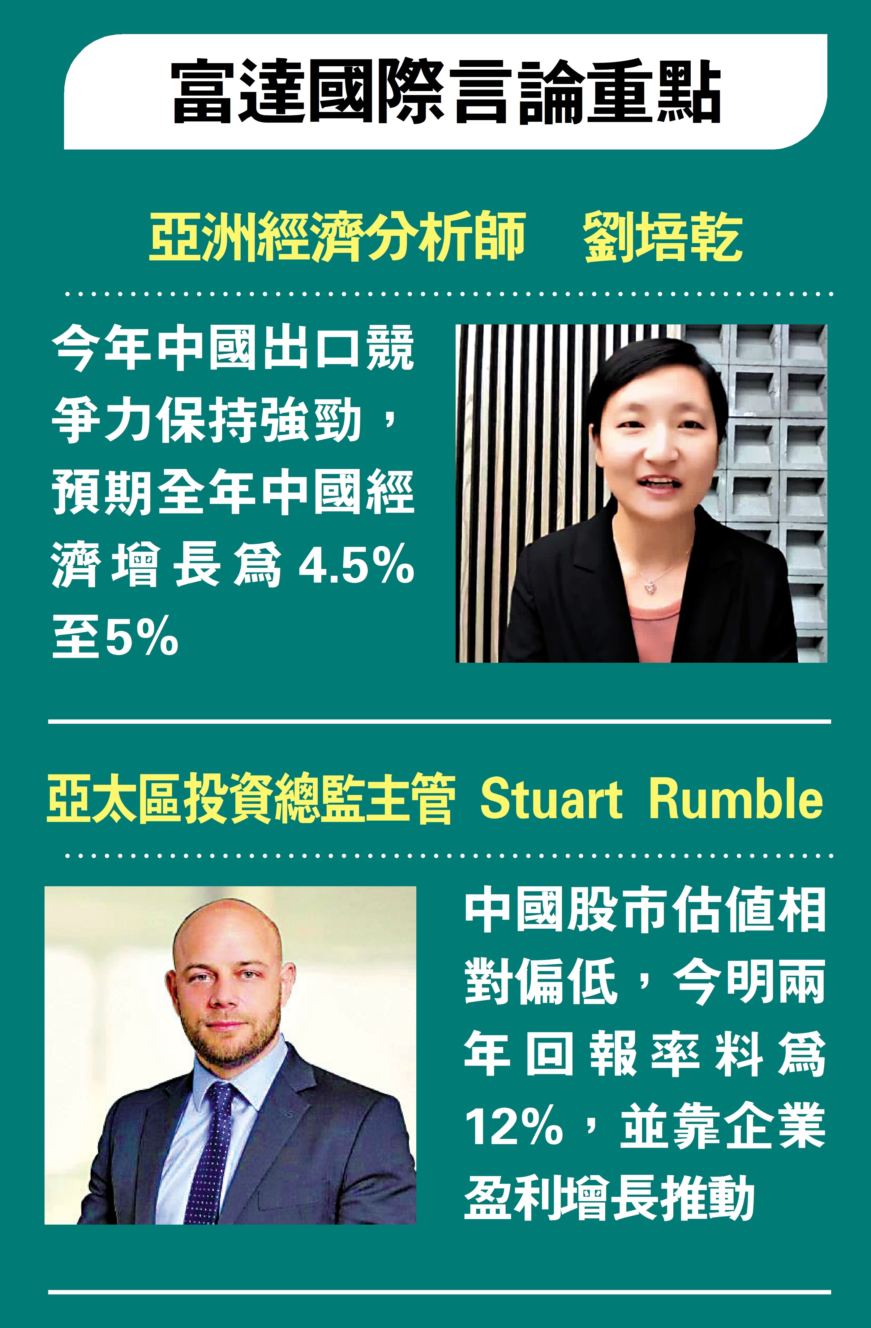 今年中國出口競爭力保持強勁,預期全年中國經濟增長為4.5%至5%。