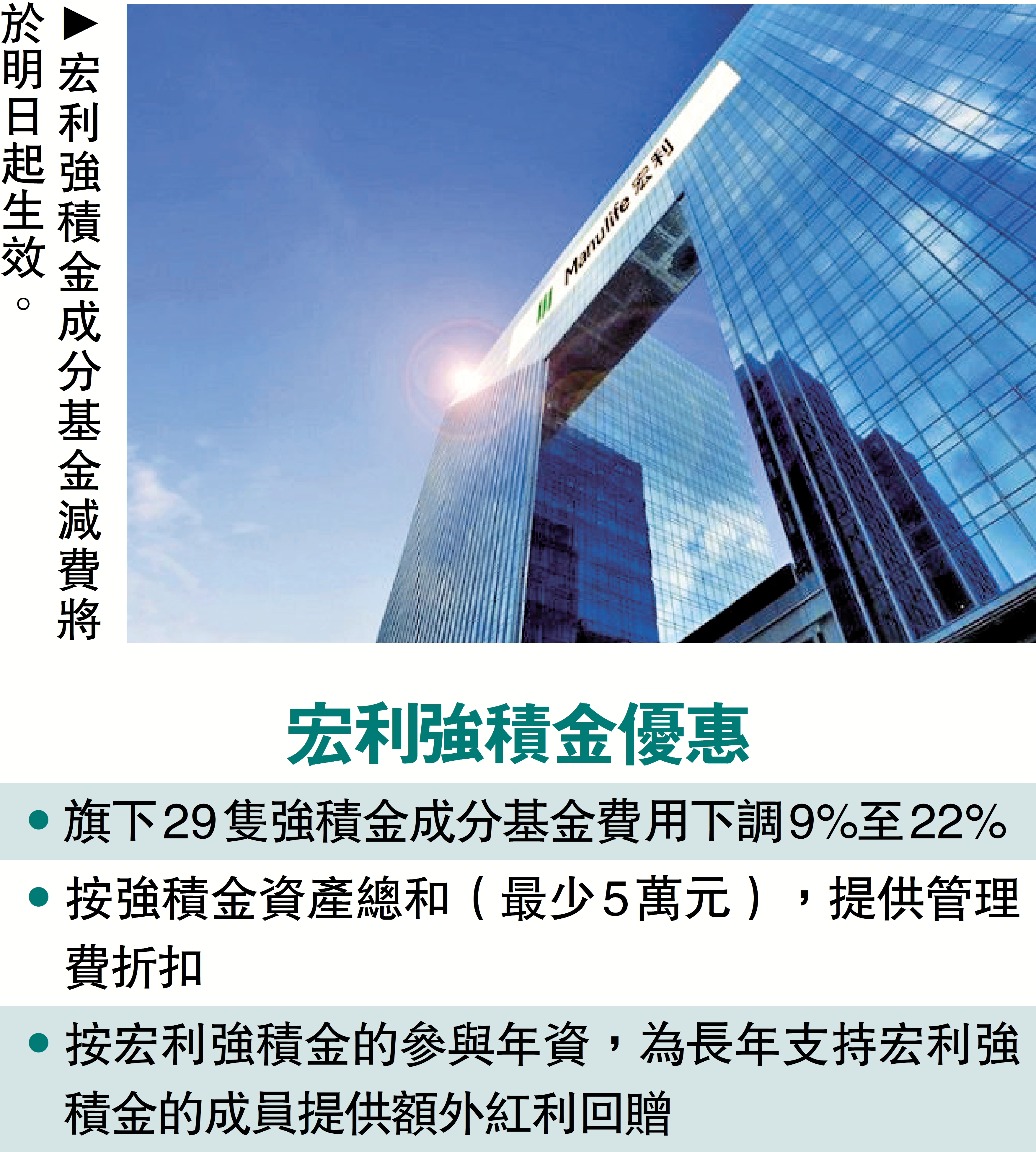 首個專屬優惠級別按強積金資產總和,涵蓋最多13隻成分基金,管理費折扣適用於低至累計資產總值5萬元;第二個優惠級別按宏利強積金的參與年資,涵蓋最多26隻成分基金。