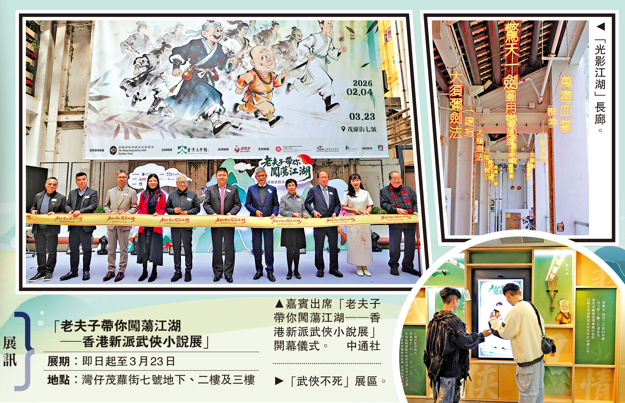 「老夫子帶你闖蕩江湖─香港新派武俠小說展」即日起於香港文學舘舉行,結合香港家喻戶曉的漫畫形象「老夫子」與備受矚目的新派武俠小說,以跨媒介、互動式及場景化的策展方式,呈現香港新派武俠小說的發展脈絡、敘事特色與名家風采。展覽從視覺語言與文學精神出發,回應兩者所承載的本土情懷與集體記憶,並以創新形式拉近公眾,尤其年輕讀者,與香港文學的距離。展覽展期至3月23日,免費入場。\大公報記者 郭悅盈(文、圖)
