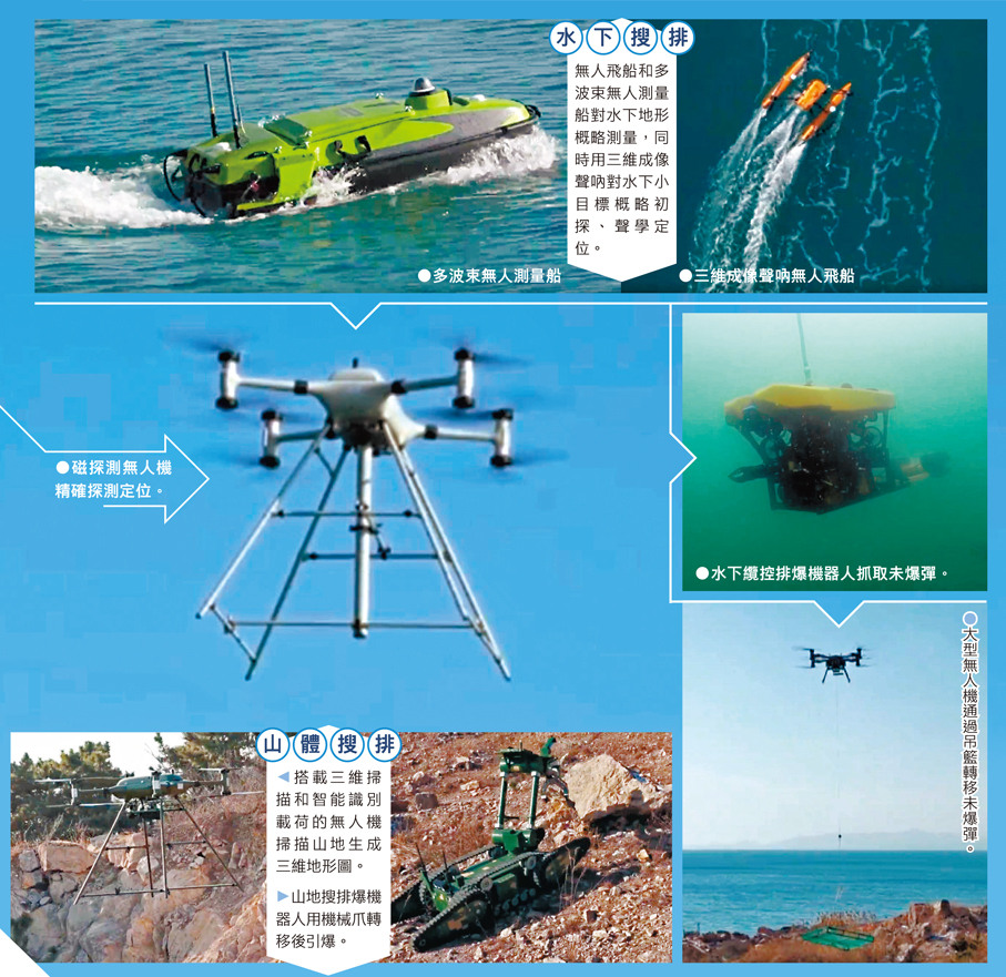 北部戰區海軍某部指戰員董吉安介紹:「首先由無人飛船和多波束無人測量船互相配合作業,對水下地形進行概略測量,生成水下地形圖;接着它們同時用三維成像聲吶對水下小目標進行概略初探、聲學定位;第三步就是磁探測無人機對水下目標鐵磁性物質進行精確探測定位。」