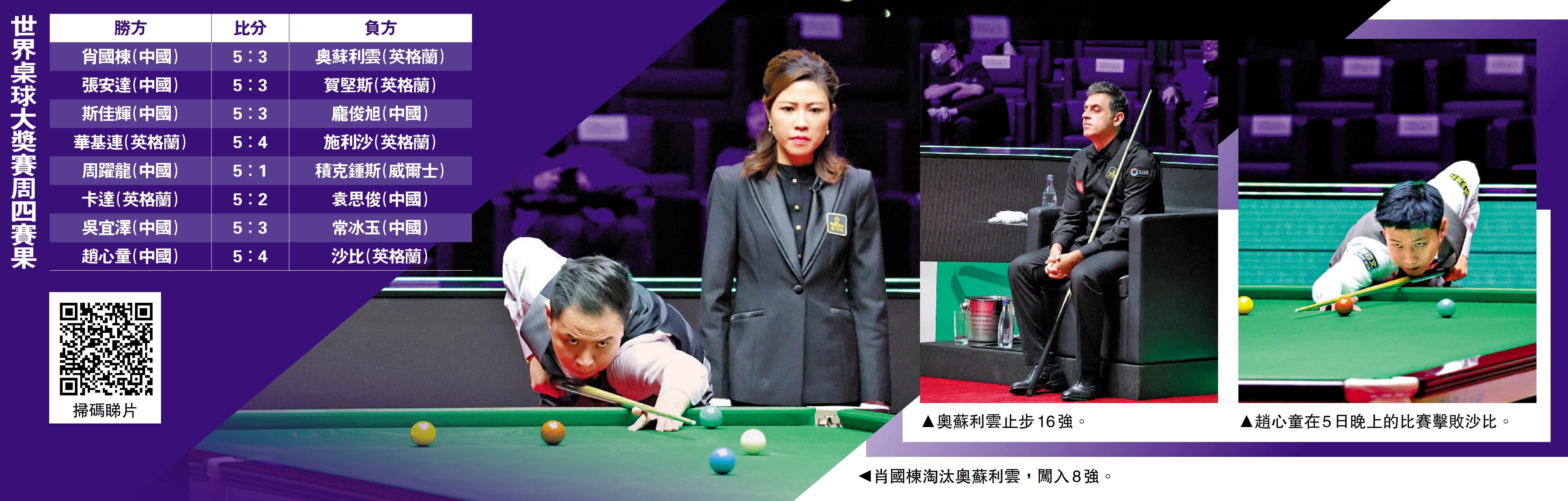 世界桌球大獎賽2026昨(5日)在啟德體藝館展開16強賽事,「中國兵團」除了「大師兄」丁俊暉外,其餘9位參賽球手皆躋身16強賽事。其中,肖國棟在昨午對陣英格蘭名將「火箭」奧蘇利雲,前者發揮十分出色,最終以局數5:3順利晉級。另一位中國球手趙心童在晚上則對陣英格蘭的沙比,最終前者以5:4反勝。而經過一日角逐,肖國棟、張安達、斯佳輝、周躍龍、趙心童、吳宜澤等6位好手成功躋身8強,再度創下歷史,他們將在今天爭入4強。\大公報記者 朱家立(文、圖)