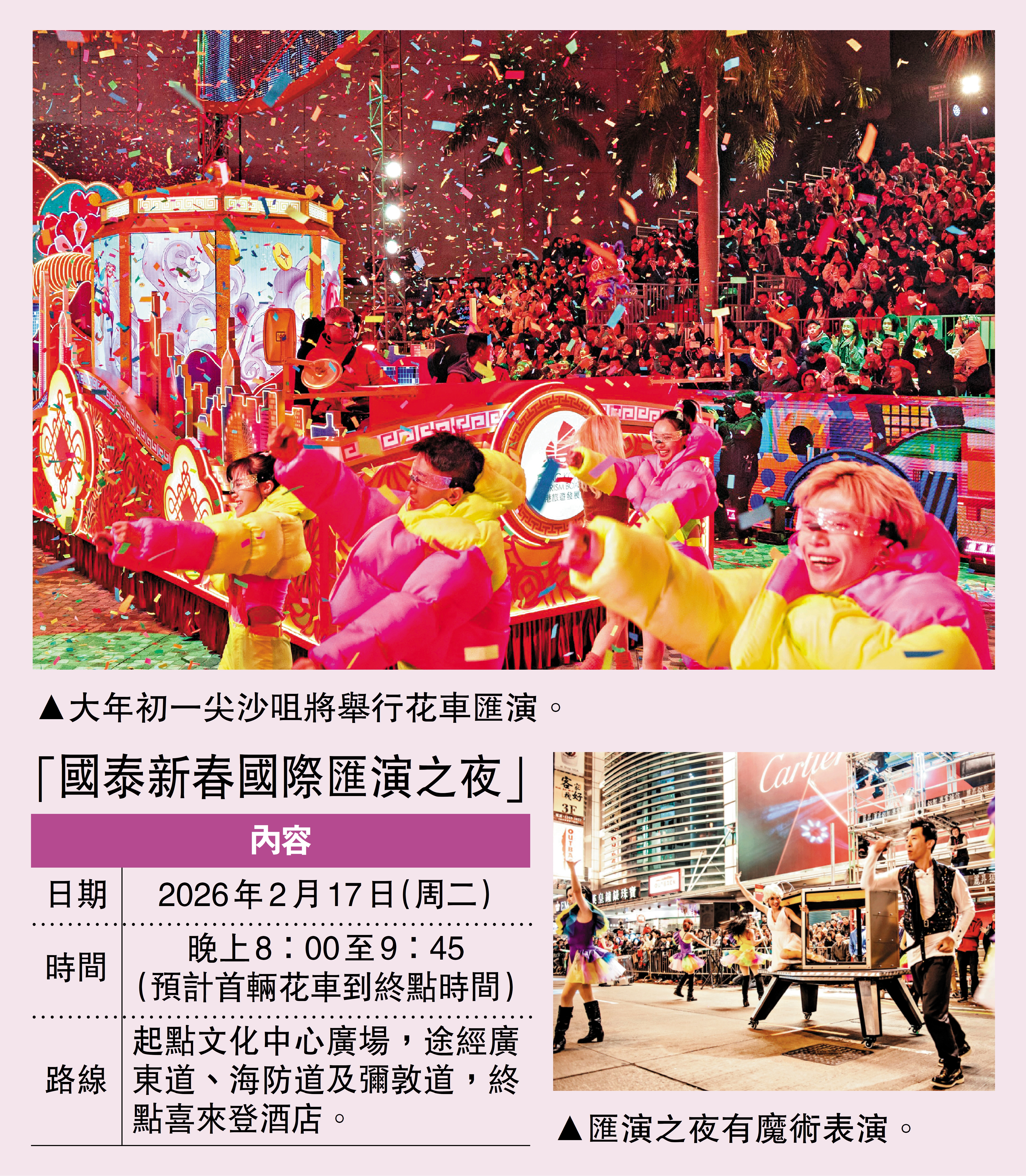 【大公報訊】香港旅遊發展局主辦的「國泰新春國際匯演之夜」,將於大年初一(17日)晚上在尖沙咀舉行。花車匯演於香港文化中心設有觀眾座位,於明日(7日)上午8時起,在尖沙咀天星碼頭的旅發局九龍旅客諮詢中心發售。