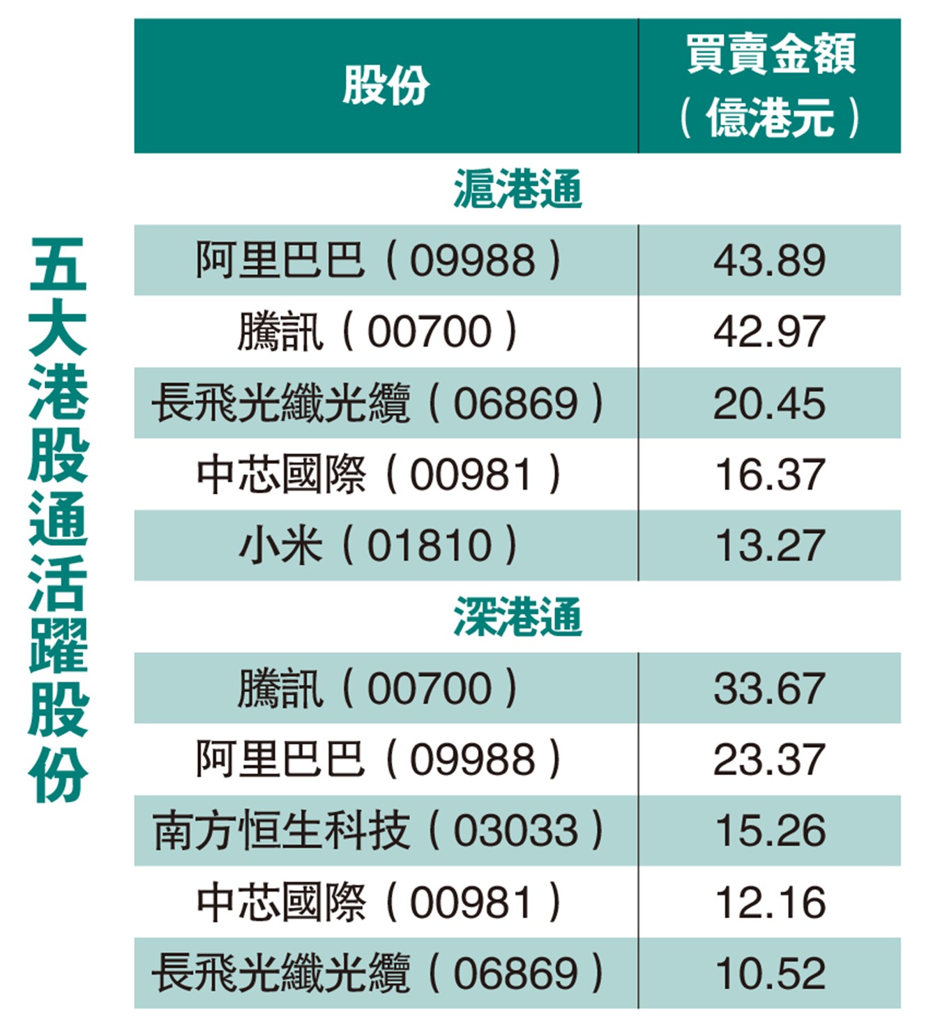 在跌市中,北水積極入市。數據顯示,昨日北水淨流入騰訊(00700)及阿里巴巴(09988),金額分別43.24億及16.56億元;同時長飛光纖光纜(06869)淨流出約7868萬元。在滬深兩市的港股通中,騰訊均為資金淨流入最活躍的股份,而淨流出較多的股份則包括小米(01810)與康方生物(09926)。
