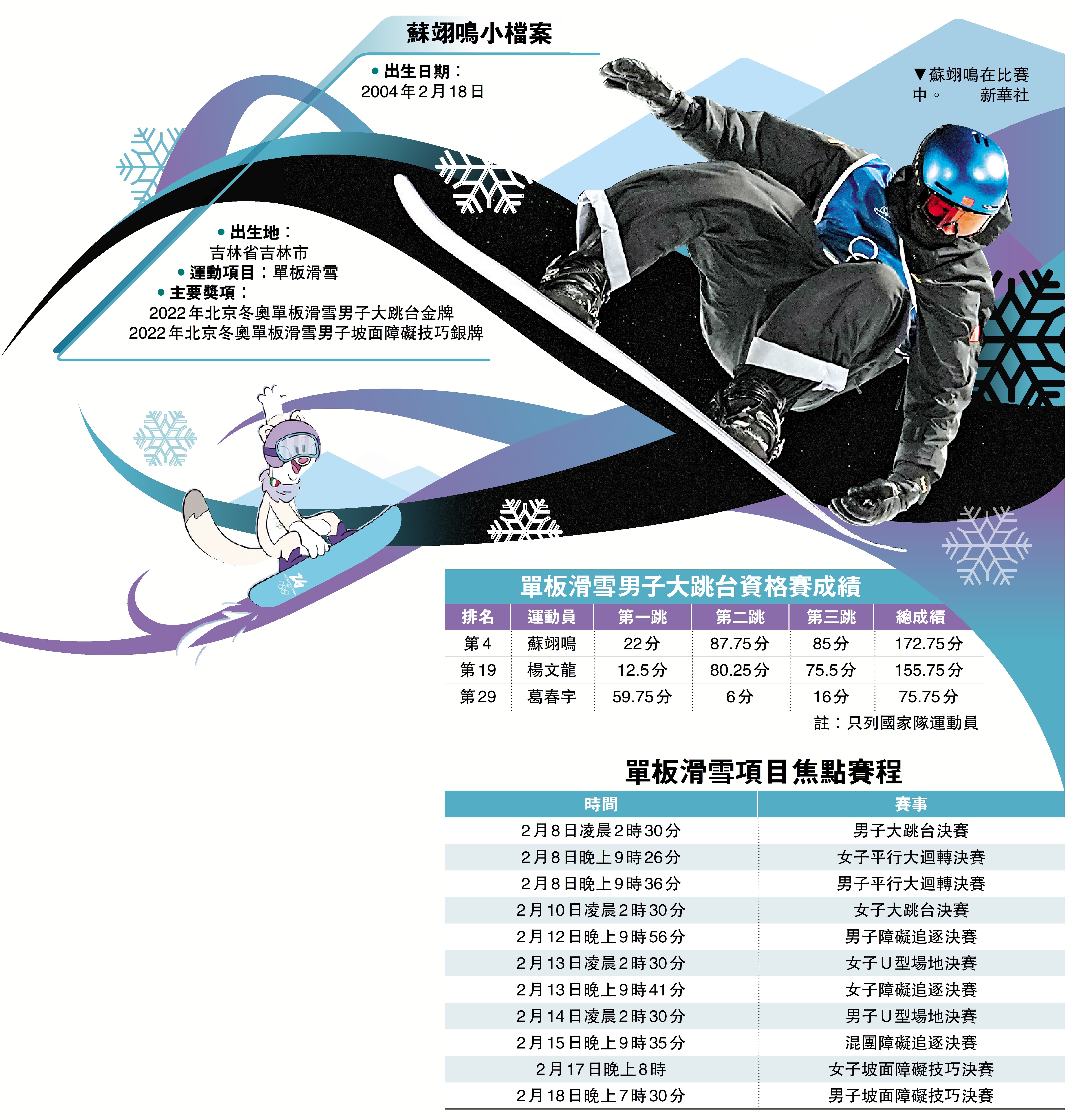 在5日晚進行的米蘭冬奧會男子單板滑雪大跳台資格賽中,爭取衛冕冠軍蘇翊鳴在第一跳失誤的情況下,憑着後兩跳的穩定發揮,以172.75分的總成績位居第4晉級決賽。葛春宇、楊文龍被淘汰。
