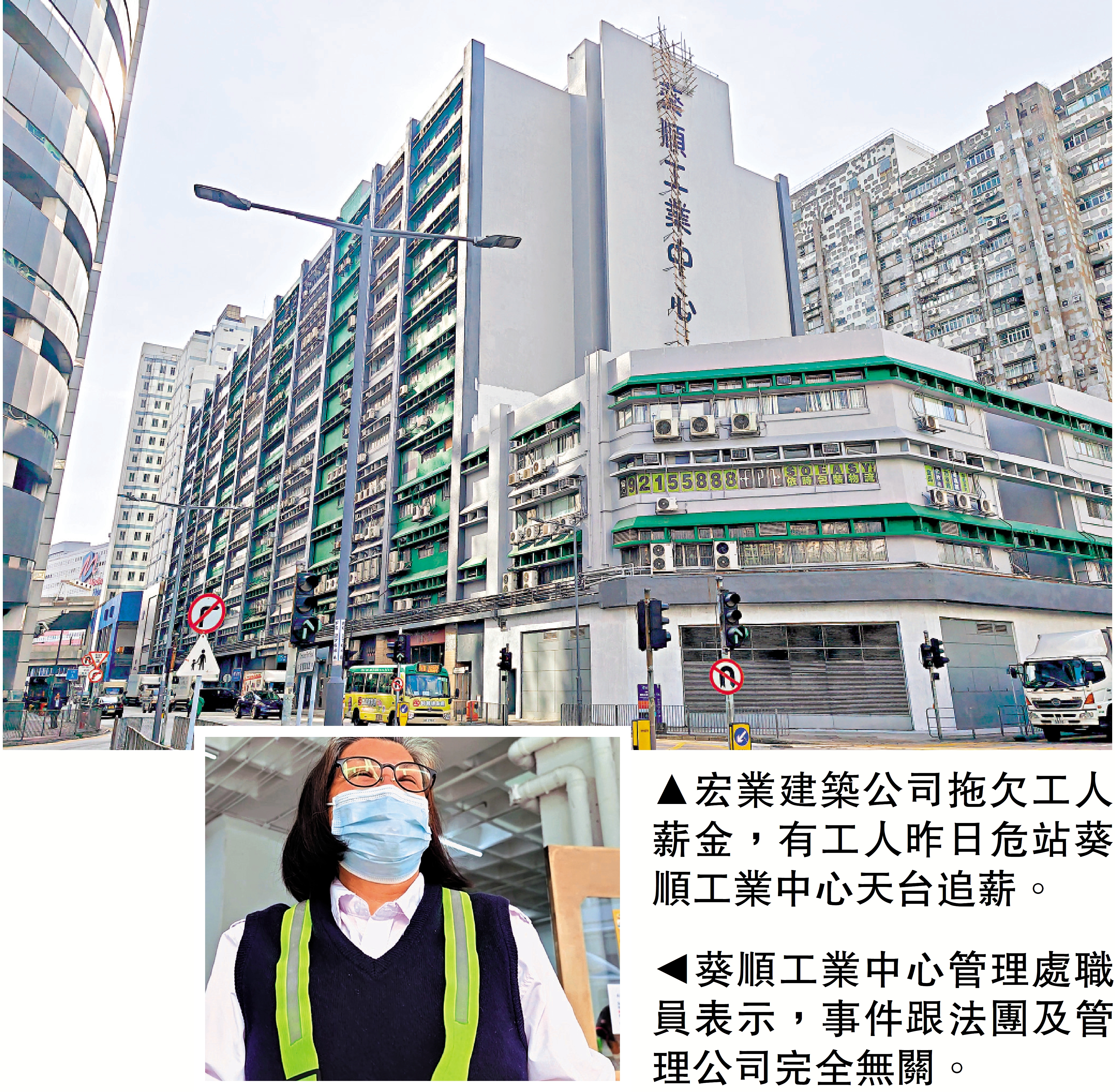 據了解,葵順工業中心收到強制驗樓令後,去年委託宏業為承建商進行大維修。宏福苑大火後,葵順工業中心管理處11月28日接「宏業」通知暫時停工,大廈法團及管理處考慮大廈強制驗樓訂明修葺工程之安全情況,同意有關工程暫停,餘下工程會在商議後再作決定。大廈管理處職員對大公報記者表示,事件跟法團及管理公司完全無關,是宏業拖欠裝修工人薪金所致,警員到場後,好快已解決事件,將工友游說到安全地方。