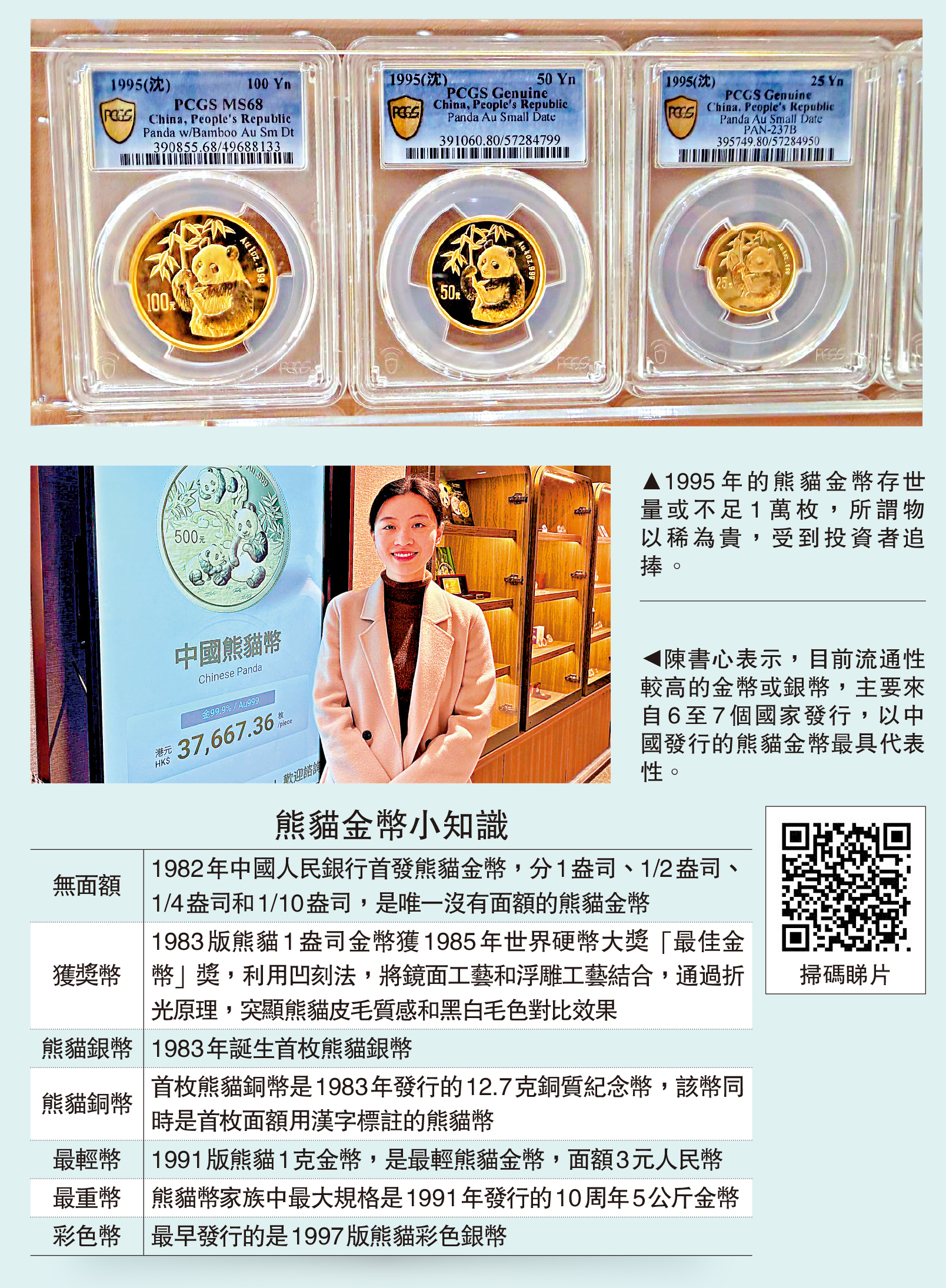 陳書心表示,隨着九十年代收藏熱情升溫,令熊貓金幣大批量轉向內銷,由於需求量不大,市面流通量亦較少,所謂物以稀為貴,例如1995年熊貓金幣存世量可能不足1萬枚。以現時金價計算,二分之一盎司金幣約1.7萬元,但二級市場的回收價高達10萬元。