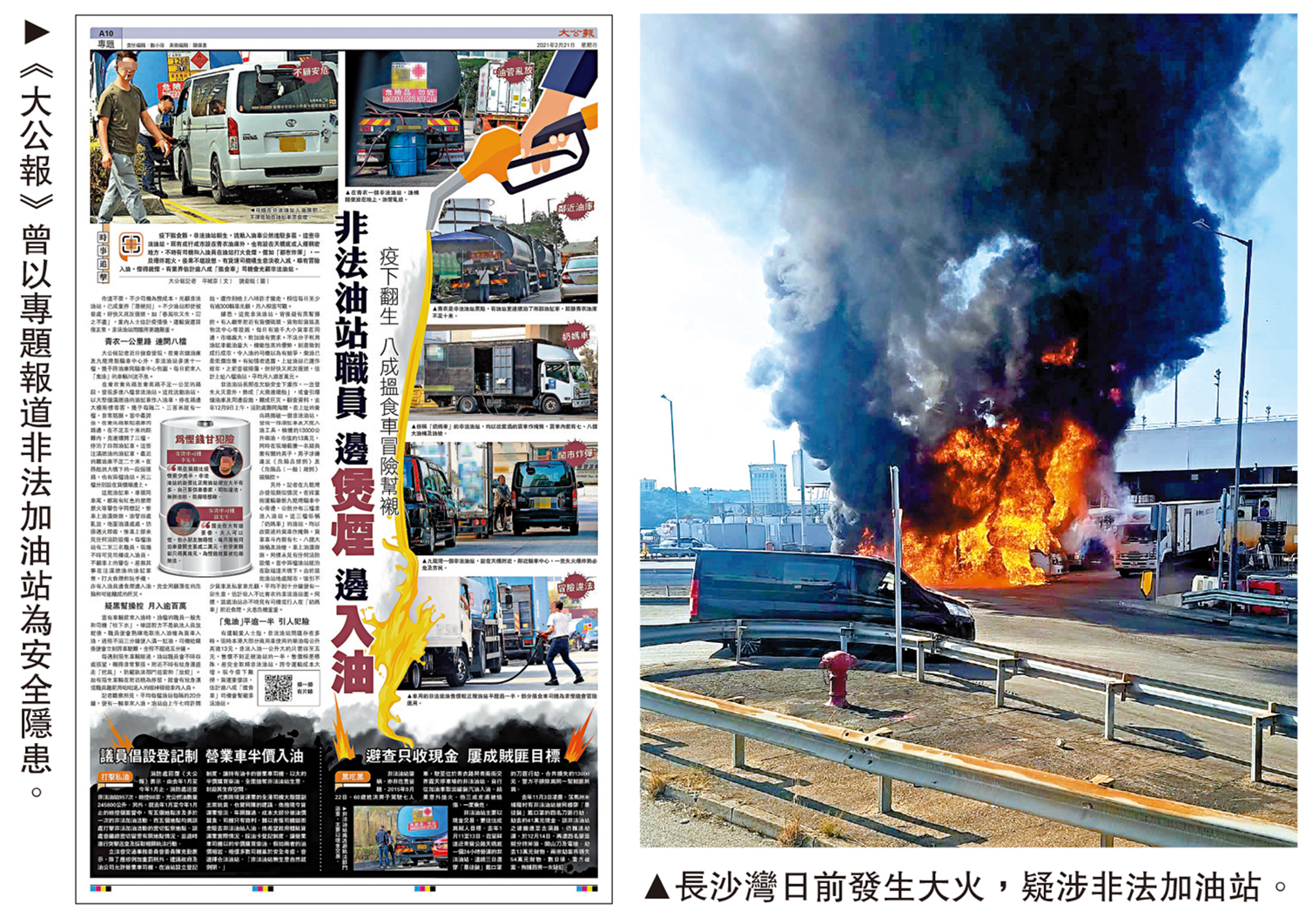 警方前日下午3時22分接報指一輛輕型貨車起火,火勢波及另外2輛中型貨車、4輛輕型貨車和一輛私家車。消防員到場後將火救熄,初步調查發現,一輛嚴重焚毀的輕型貨車上有油缸、油槍及油喉等工具,相信是非法改裝而成的流動加油站,並強調從事非法加油活動是重罪,將會根據相關條例向有關人士提出檢控。警方昨日表示,由於起火原因有可疑,列作「出售及買入在香港的應稅貨品」及「火警」,案件交由深水埗警區重案組跟進,暫未有人被捕。