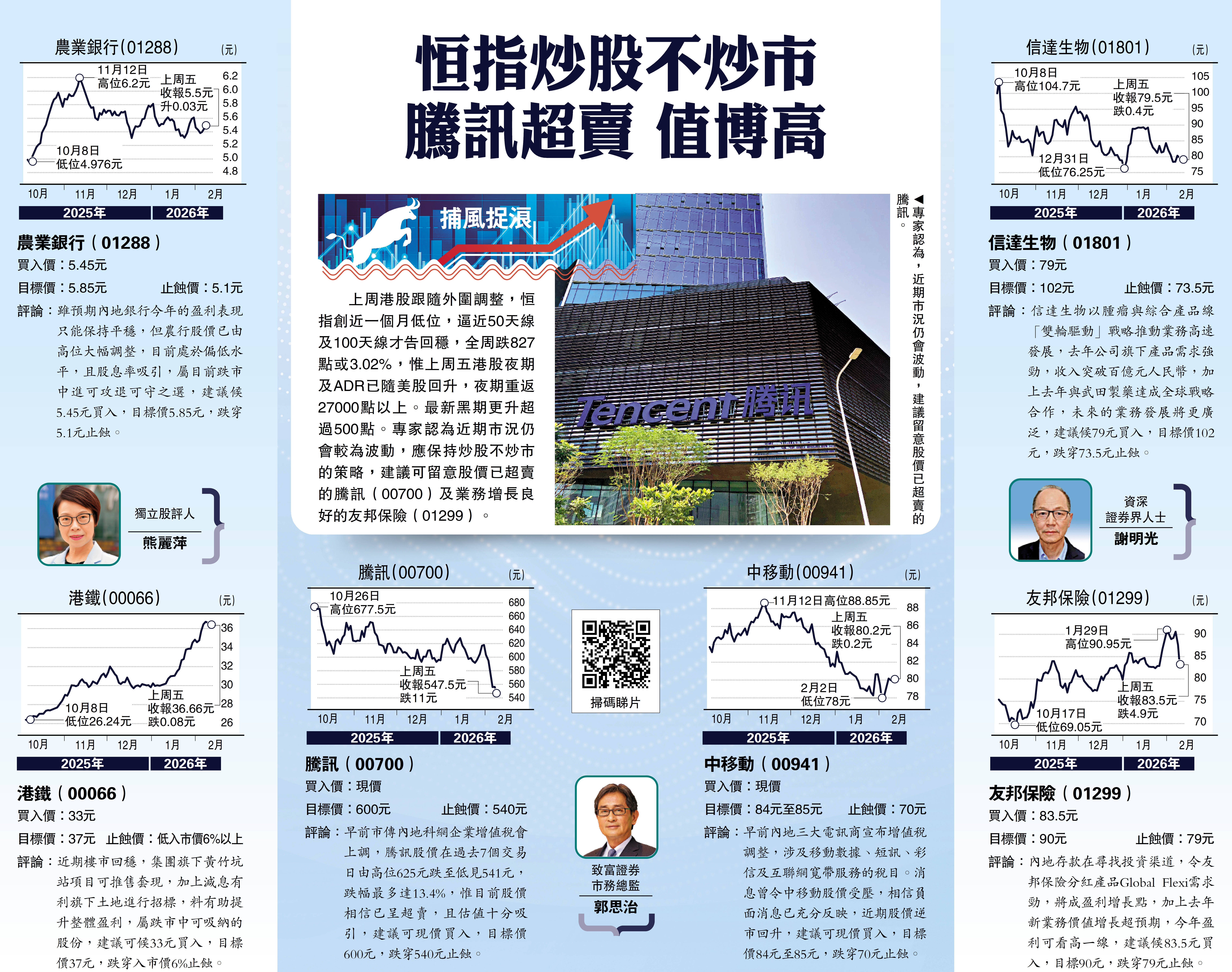 上周港股跟隨外圍調整,恒指創近一個月低位,逼近50天線及100天線才告回穩,全周跌827點或3.02%,惟上周五港股夜期及ADR已隨美股回升,夜期重返27000點以上。最新黑期更升超過500點。專家認為近期市況仍會較為波動,應保持炒股不炒市的策略,建議可留意股價已超賣的騰訊(00700)及業務增長良好的友邦保險(01299)。