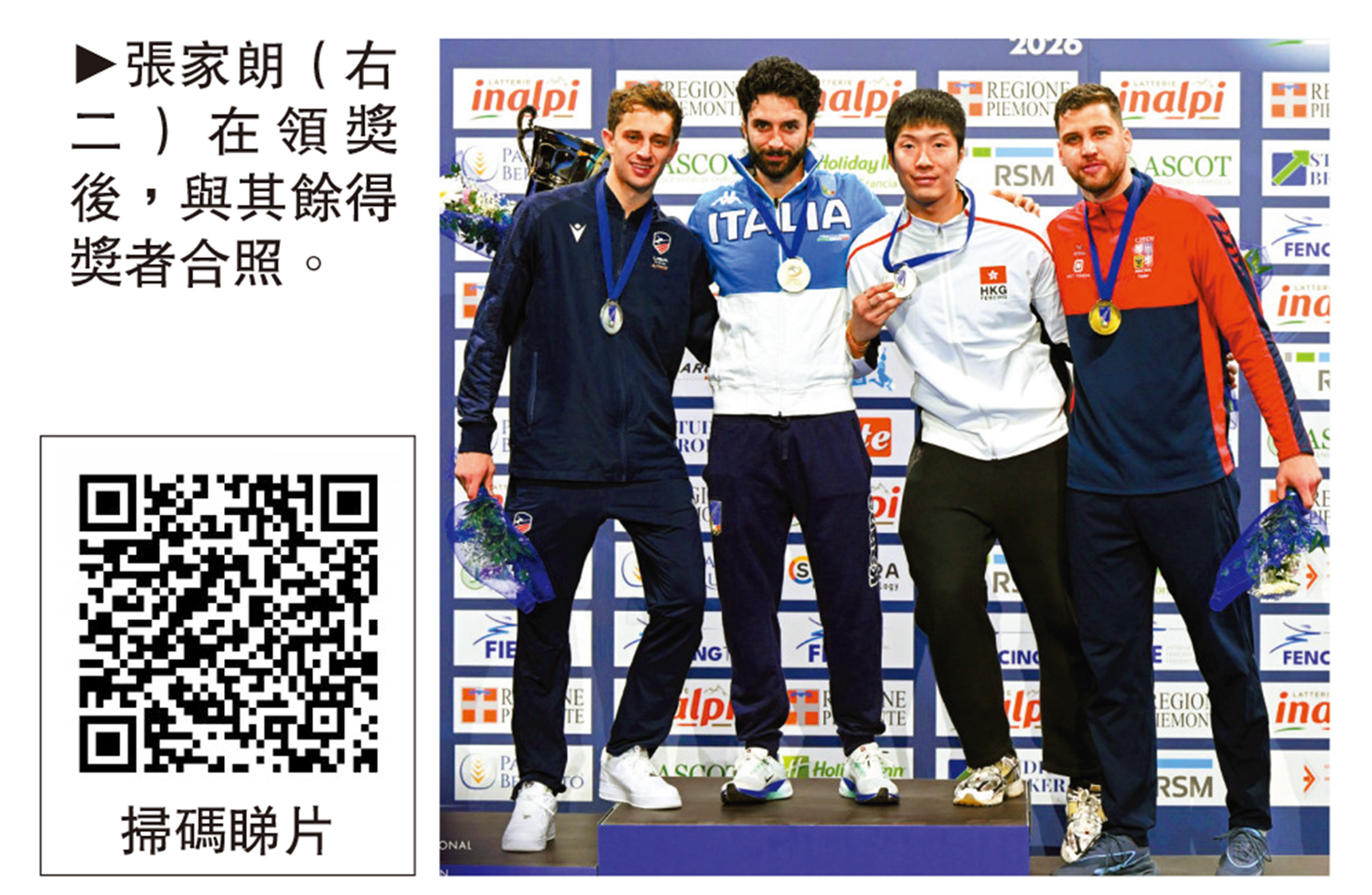 【大公報訊】記者張銳報道:兩屆奧運會冠軍、中國香港劍擊隊「劍神」張家朗,8日凌晨在意大利都靈舉行的國際劍擊聯會(FIE)大獎賽男子花劍個人賽摘得銅牌。這是他繼2019年銀牌及2024年金牌後,第三度在這座被其稱為「福地」的城市登上頒獎台,亦是他於2025至2026賽季獲得的首枚個人排名賽獎牌。