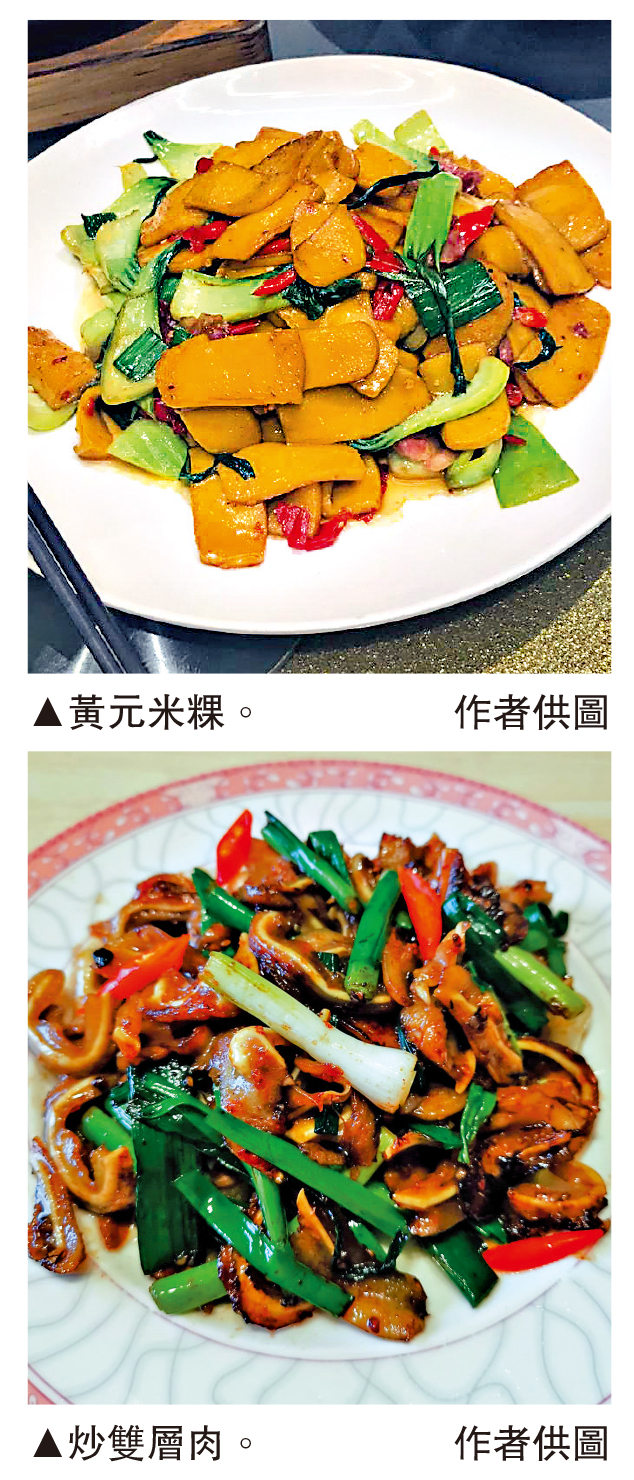 江西贛州有一道客家人過年食品,叫黃元米粿,色澤金黃的米粿,口感糯軟,像浙江的炒年糕,但它不是用糯米做的,是用當地的大禾米做的,是贛州客家人傳統食品之一,相傳在唐代曾被列為貢品。農曆十二月下旬,是贛州客家人忙於備年貨的日子,也包括了「打黃元」,他們把山中一種叫黃荊條的小灌木,燒成灰後用來泡水,拌入米中蒸熟,然後倒入石臼中,用粗木棍不停地捶打,打至軟韌為止,取出放在模具中壓製成形,吃時才切成條,加白菜和臘肉炒食,也可以放湯。