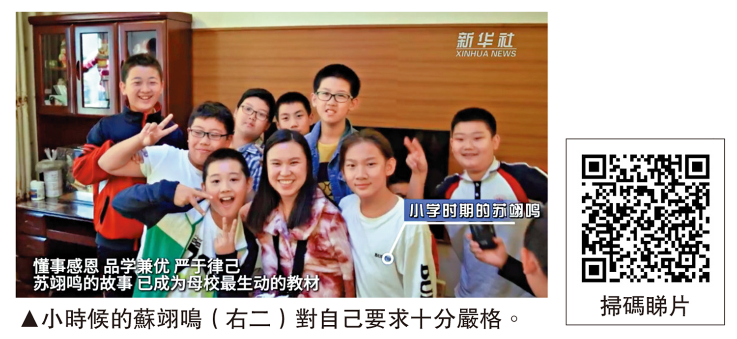 小時候的蘇翊鳴已嶄露在運動場上迎難而上的個性,何玲說:「當時在三、四年級的時候,學校的運動會是有800米賽跑的,但對於三、四年級的孩子來說,這個距離不算短,所以很多孩子都不想參與這個項目,這個時候只有蘇翊鳴站了起來,對我說要報名,要為班級爭得榮譽,報了名以後就每天回家堅持訓練,結果他真的在賽跑當中,取得了年級第一名的好成績。」