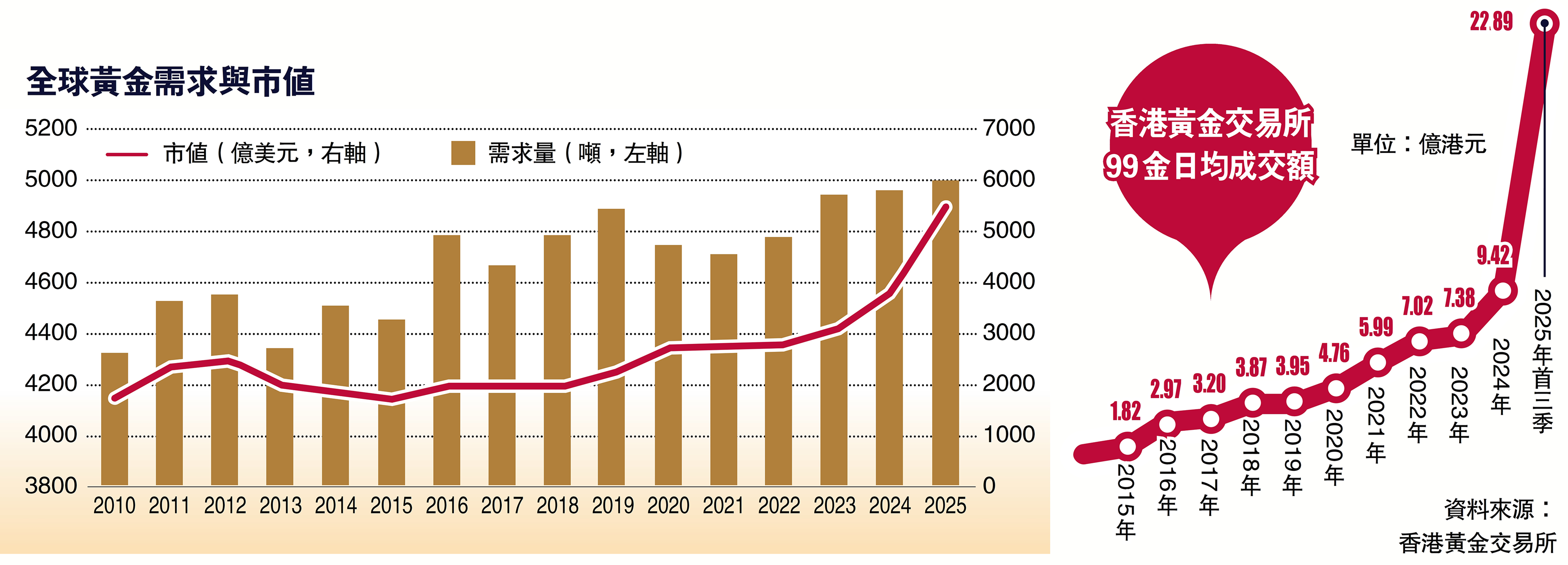黃金作為最熱門的貴金屬,在對沖通貨膨脹、貨幣貶值,以及地緣政治不確定性方面,發揮重要的作用。香港黃金交易所數據顯示,過去十年,本港99金成交額持續有增無減,2024年平均每日成交額約9.42億港元,按年增長27.6%。2025年首三季,本港99金的平均每日成交額更達22.89億元,按年飆升1.3倍。