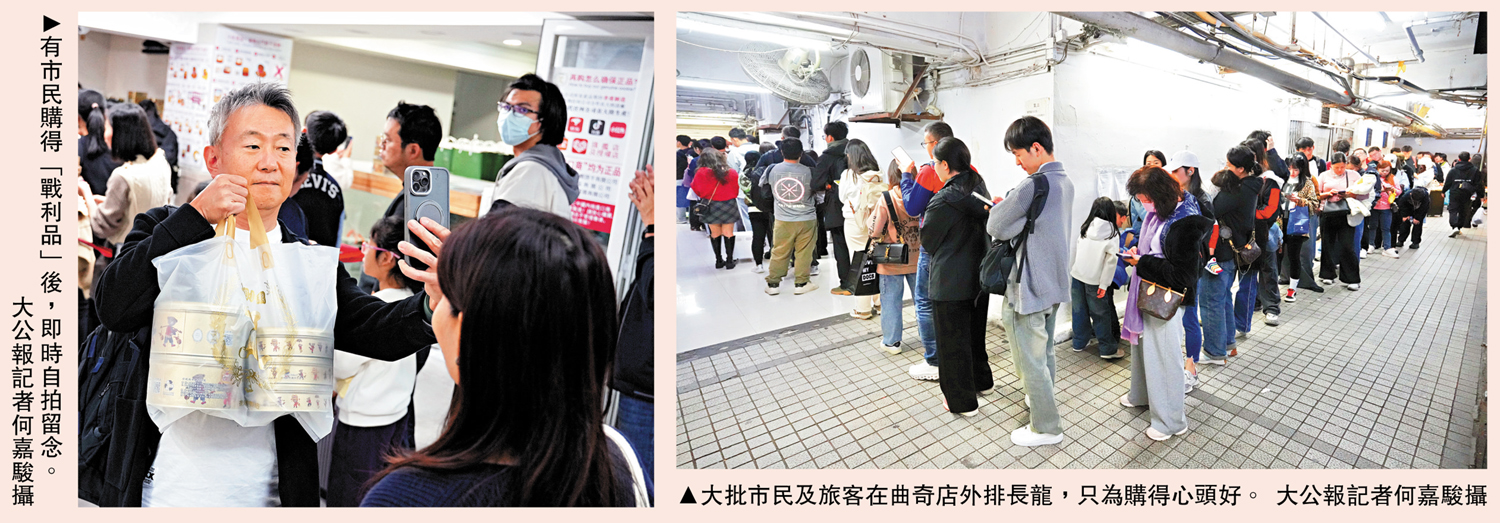 【大公報訊】記者張騰報道:農曆新年將至,不少訪港遊客趁遊港期間辦年貨,曲奇餅、名牌手袋、金飾、玩具盲盒,甚至港產保健品,都成為辦年貨目標。大公報記者昨日在尖沙咀觀察,廣東道名店街、曲奇餅店外大排長龍,有遊客花3000元大手購買25罐曲奇。有內地旅客表示,人民幣升值,在香港用人民幣消費較去年更化算,所以更喜歡來港辦年貨。