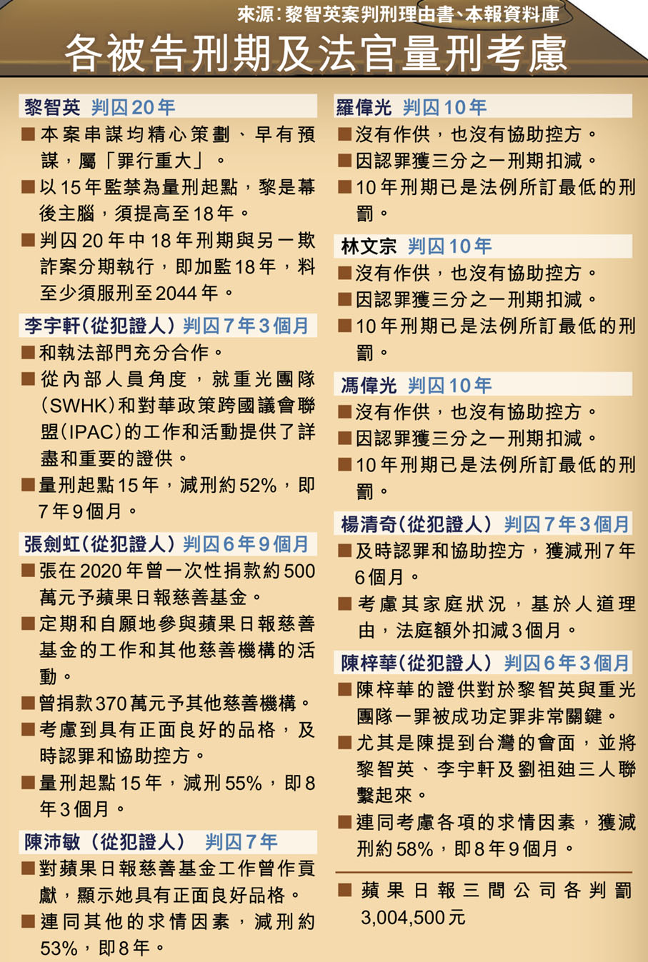 被裁定一項串謀刊印、發布、出售、要約出售、分發、展示及/或複製煽動刊物罪和兩項串謀勾結外國或者境外勢力危害國家安全罪全部罪成的壹傳媒創辦人黎智英,昨日被判監禁總刑期20年,其餘被告監禁6年3個月至10年。判刑理由書長達47頁,詳細列明每項控罪的量刑起點、加刑及減刑考慮因素,法庭強調黎智英確實促成了外國政府針對香港特區以及針對中國及香港特區政府官員採取所謂「制裁」等,屬「罪行重大」,更是危害國家安全的幕後主腦和推動者,精心策劃、早有預謀,但法庭考慮到他的健康狀況等因素,酌量減刑。