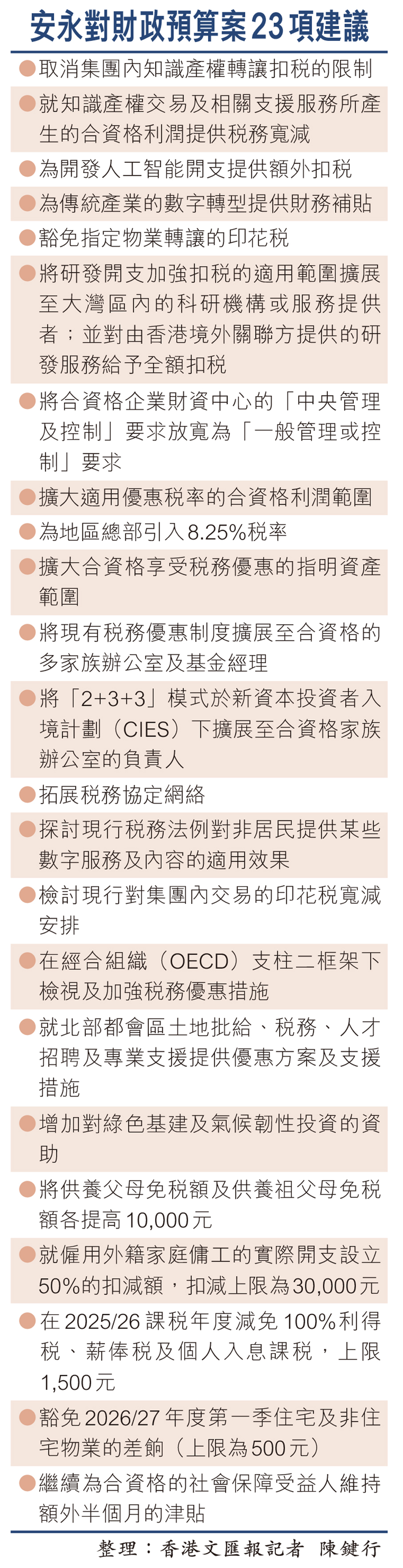 特區政府新一份財政預算案將於本月25日公布,近期有不少專業機構就新財案建言獻策,國際會計師事務所安永昨日主要圍繞優化本港稅務方面,提出23項財政措施(見附表)。短期而言,建議將供養父母免稅額及供養祖父母免稅額各提高10,000元;就僱用外籍家庭傭工的實際開支設立50%的扣減額,扣減上限為30,000元;長期而言,建議香港在國家「十五五」規劃建議的指引下,應積極推動具針對性的資本投資,包括創科領域以及北部都會區的發展。