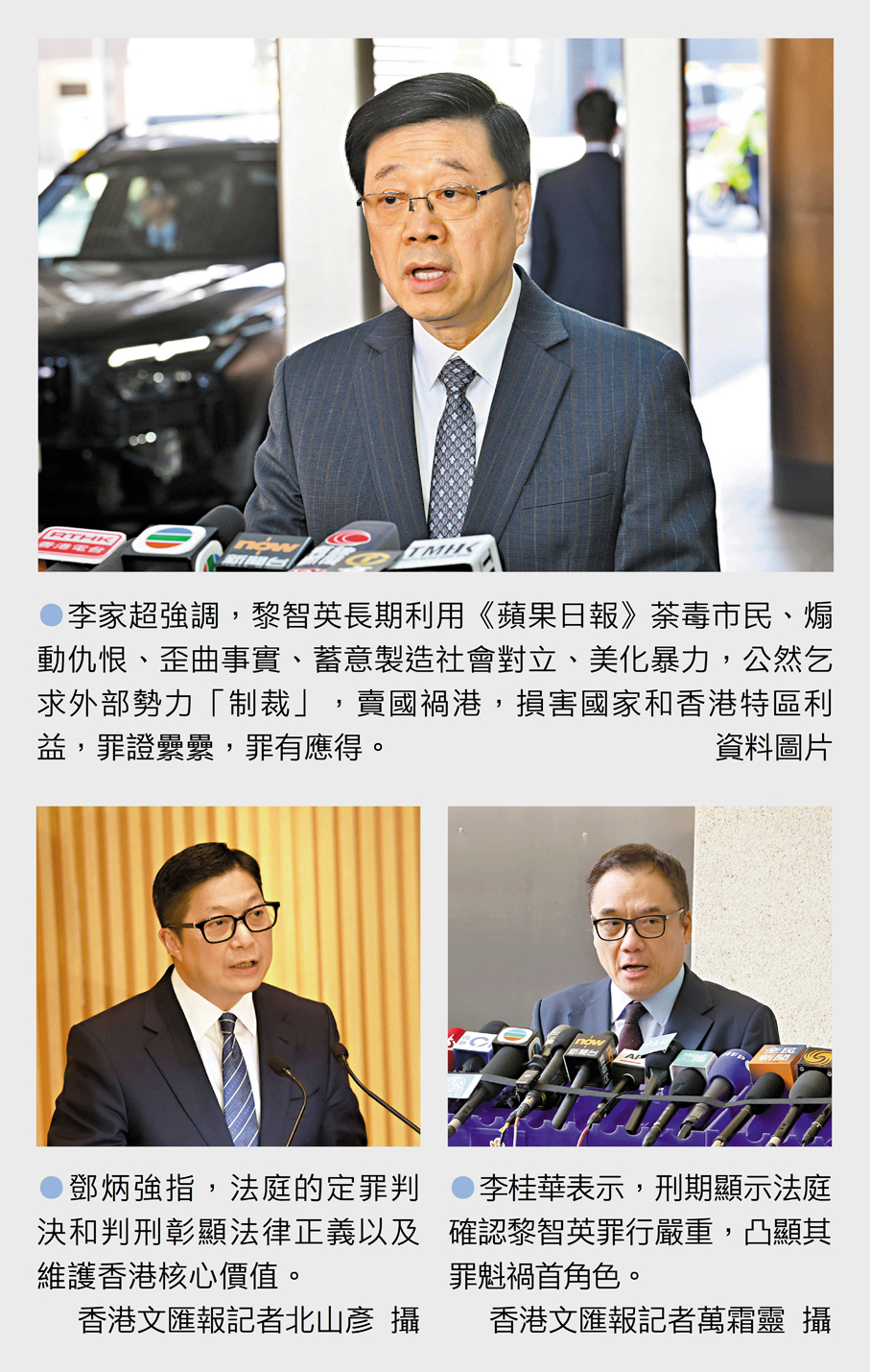 香港文匯報訊 反中亂港首惡黎智英罪有應得,面臨總刑期20年的鐵窗歲月,其餘8名被告則被判監禁6年3個月至10年不等。香港特區行政長官李家超回應指出,黎智英罪行滔天,惡貫滿盈,被重判入獄20年,彰顯法治,伸張正義,大快人心。他強調,黎智英長期利用《蘋果日報》荼毒市民、煽動仇恨、歪曲事實、蓄意製造社會對立、美化暴力,公然乞求外部勢力「制裁」中央、「制裁」香港特區,犧牲人民福祉,賣國禍港,損害國家和香港特區利益,罪證纍纍,罪有應得。