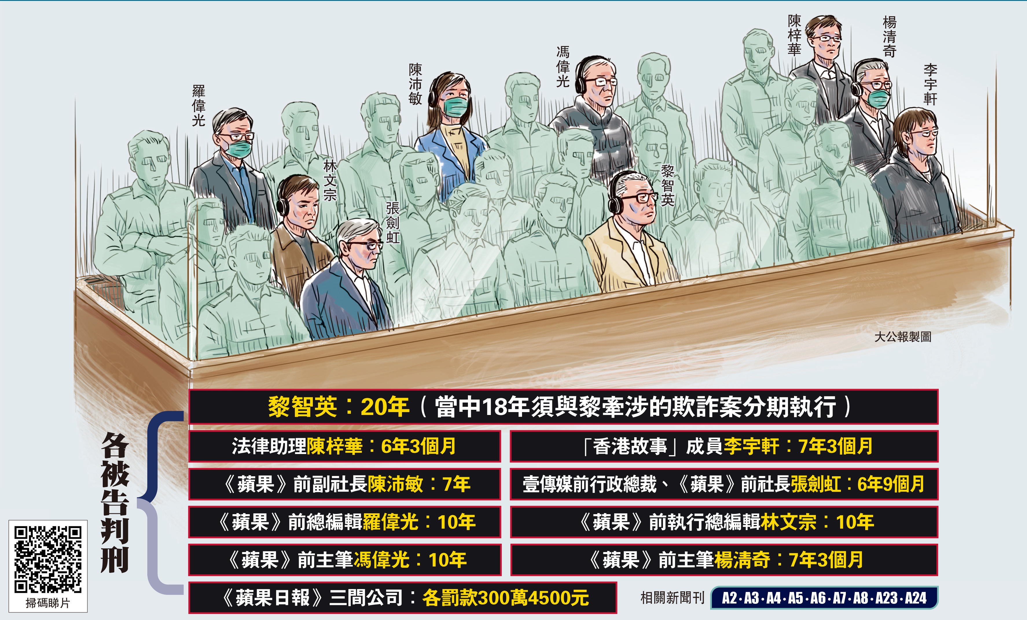 高等法院原訟法庭昨日就黎智英及另外八名被告,以及《蘋果日報》相關三間公司被控共三項危害國家安全罪行的定罪作出判刑。反中亂港首惡分子、案件主腦黎智英在本案的總刑期為20年,其餘八名被告則被判監禁6年3個月至10年不等。《蘋果日報》三間相關公司各被判罰款3,004,500港元。