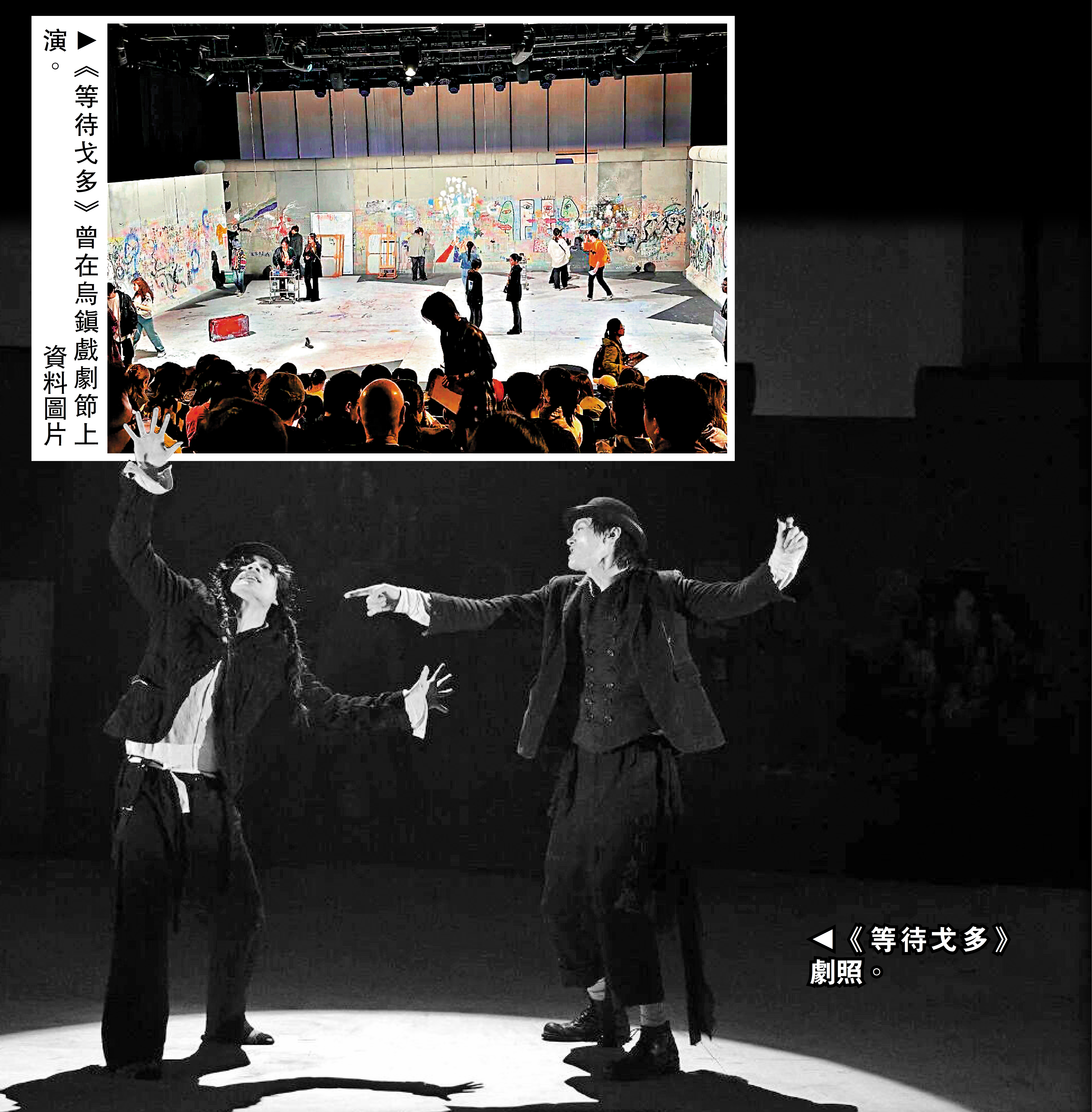 今次演出將讓觀眾沉浸式參與體驗。演出開始前,觀眾可在舞台的巨型塗鴉牆上,書寫或描繪自己對「等待」的想法,與劇中人物展開一場打破劇場空間的對話。舞台上貝克特的巨型肖像,象徵觀眾與這位荒誕大師的百年對話。演員則以張弛有度的表演,呈現後現代的荒誕精神狀態,讓劇場成為導演與觀眾共同創造的「遊樂場」。