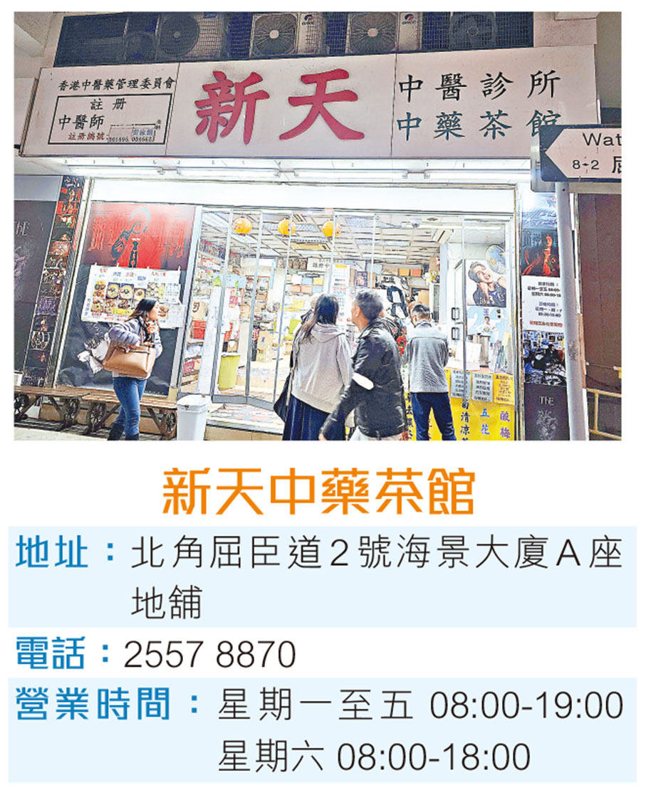 漢堡扒與凍檸茶令人快樂,Raymond還推薦同樣在拳館附近的新天中藥茶館,其雞骨草去濕茶在他訓練期間成為消除疲勞的良方:「新天中藥茶館最有名的是鯊魚燒賣,但我最愛的是雞骨草去濕茶,這支涼茶特別適合睡眠不足、經常感到疲倦的人士,當我在訓練感到疲累的時候,就會來買一支涼茶喝,很快就能回復精神繼續拚搏!」