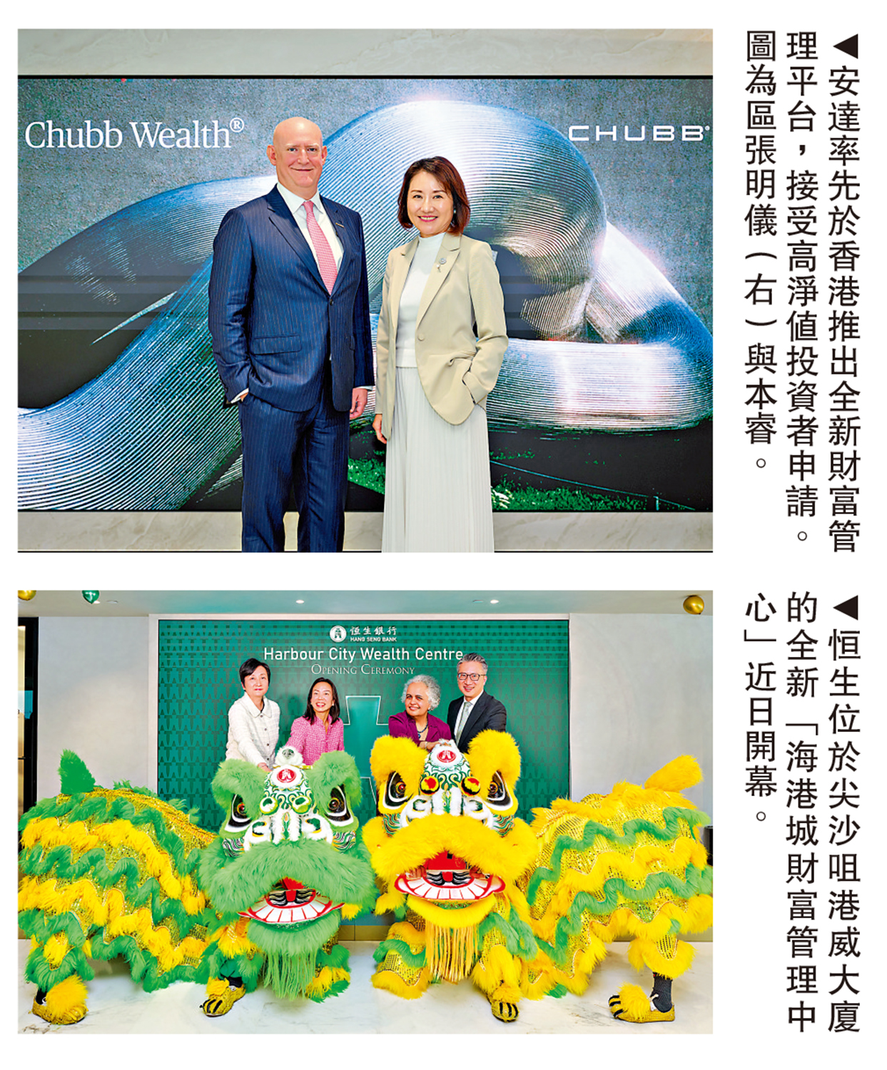 【大公報訊】大行看好香港財富管理樞紐地位,加碼投資。安達集團旗下全資附屬安達資產管理(香港)宣布,推出全新的財富管理平台安達財富(Chubb Wealth),將率先於香港推出。另方面,恒生銀行位於尖沙咀港威大廈的全新「海港城財富管理中心」,於本周二正式開幕,進一步擴大財富管理業務。