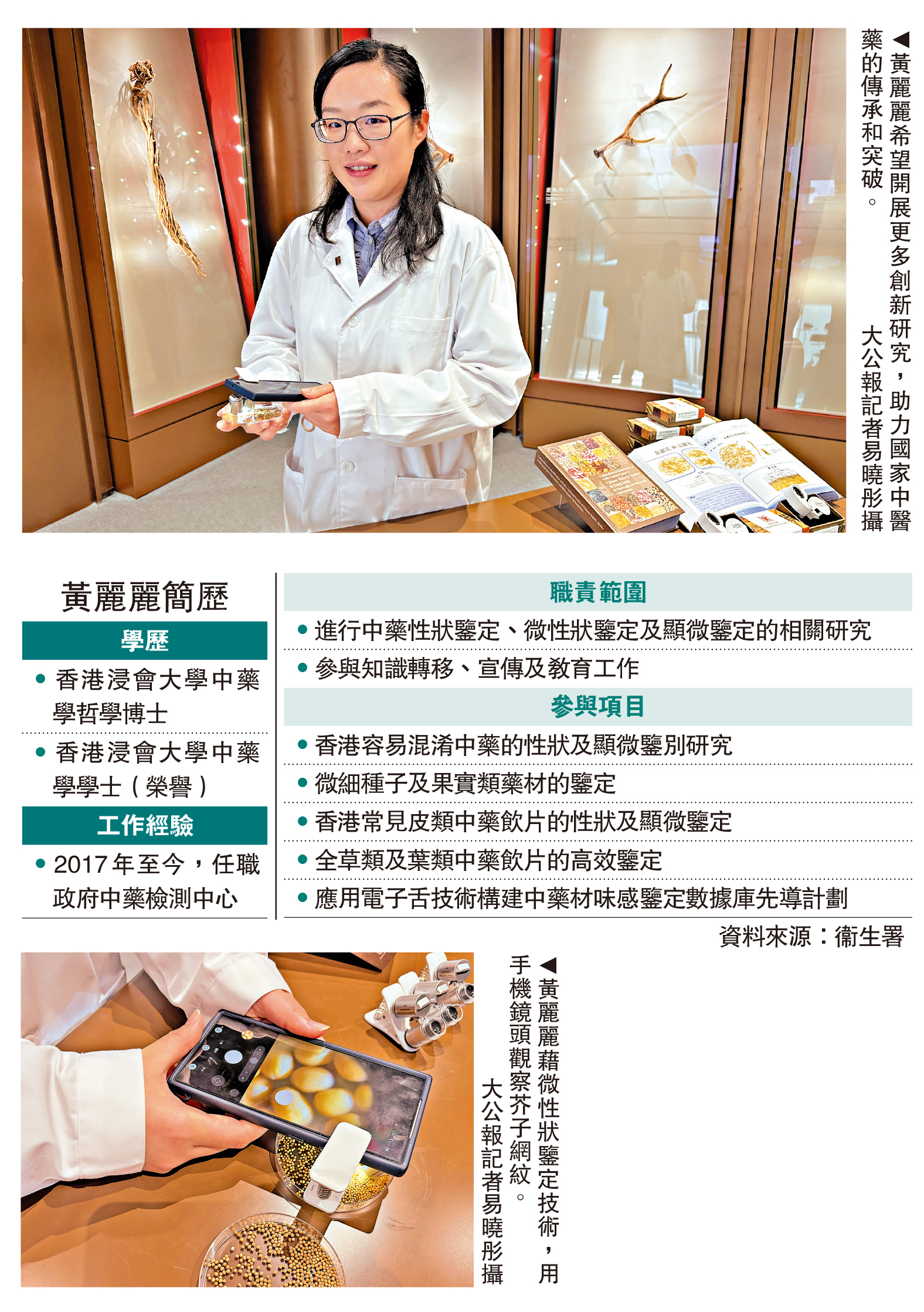 黃麗麗長期致力於中藥的性狀鑒定和顯微鑒定研究,協助檢測中心制定創新、簡便而準確的鑒定方法,她昨日接受《大公報》訪問時表示,能獲選為青年岐黃學者,體現國家對香港中醫藥科研實力的認可,她希望可以與其他頂尖的青年岐黃學者,開展更多創新研究,助力國家中醫藥的傳承和突破,同時進一步提升本港中醫藥的科研水平。\大公報記者 易曉彤
