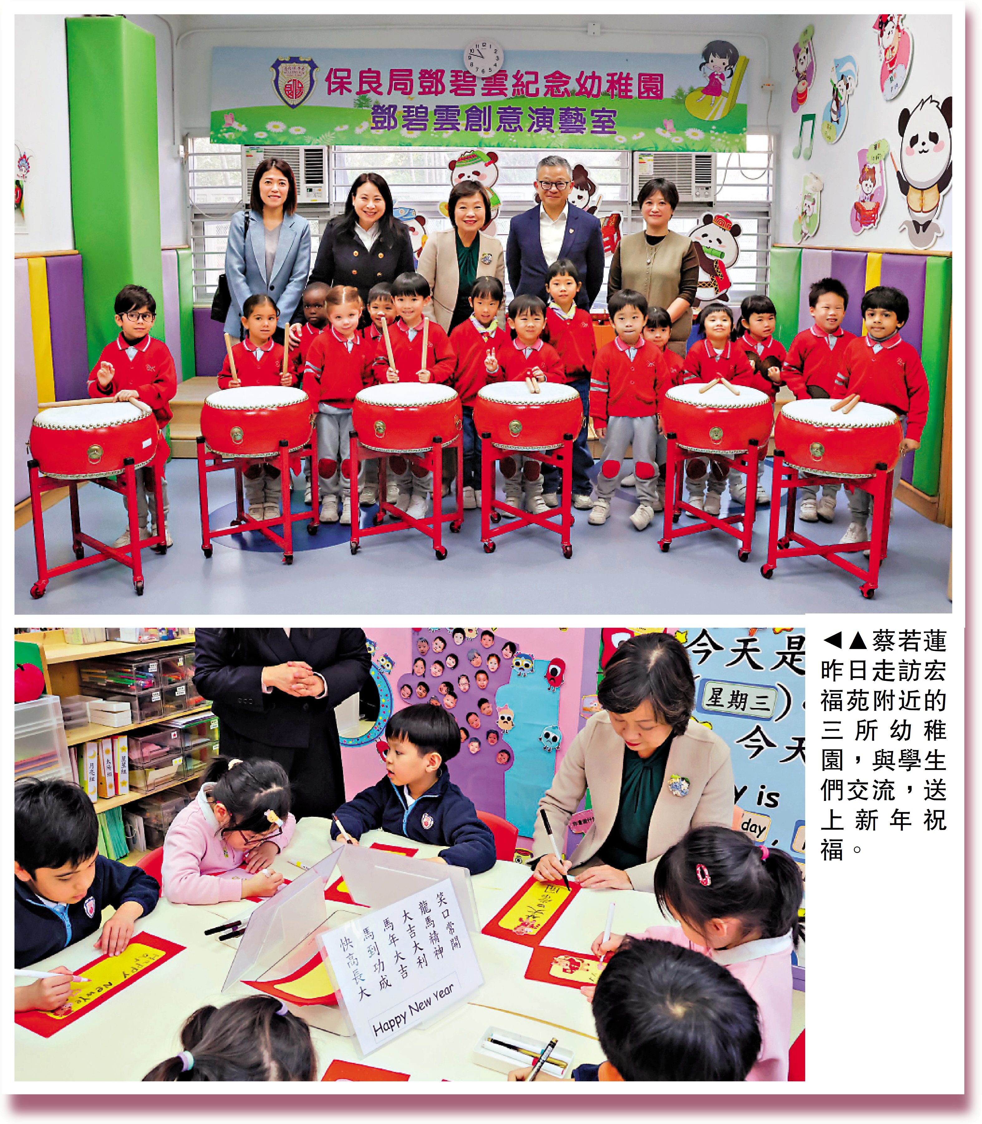 大埔宏福苑發生火災後,周邊學校一度受到影響,但在各界的努力和支援下,學生的校園生活已重回正軌。教育局局長蔡若蓮昨日走訪宏福苑附近的三所幼稚園,與校長、教師和家長交流,並在新年前夕送上祝福,打氣加油。