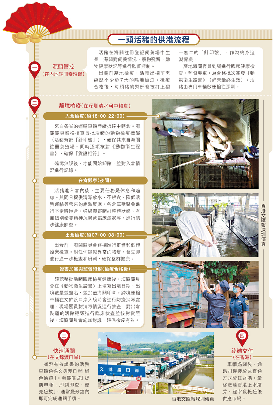 清晨六時,深圳羅湖區清水河街道尚未完全甦醒,而位於此處的供港活畜中轉倉內,豬叫聲此起彼伏。裝豬台上,四十頭經過離境檢疫的活豬,正被趕上一輛粵港兩地車牌的專用運輸車。兩分鐘後,車尾門合攏,海關關員檢查後扣上封條。這批獲得「通關憑證」的活豬,經過15分鐘車程抵達文錦渡口岸。