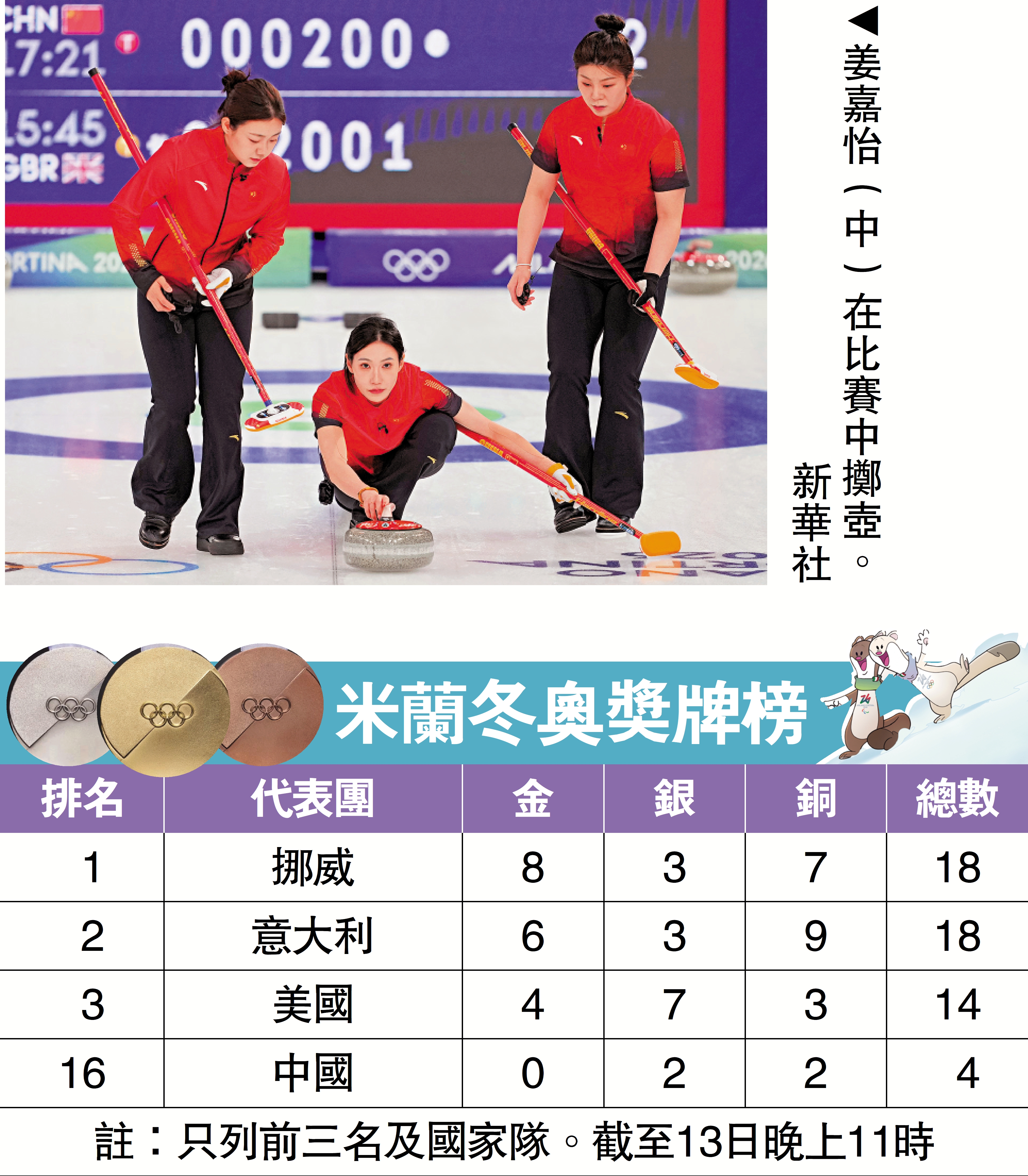 【大公報訊】據新華社報道:由四壘王芮、三壘韓雨、二壘董子齊、一壘姜嘉怡出戰的中國女子冰壺隊,12日晚迎來米蘭冬奧會開門紅。她們在循環賽首場比賽中以7:4戰勝爭取衛冕冠軍英國隊。