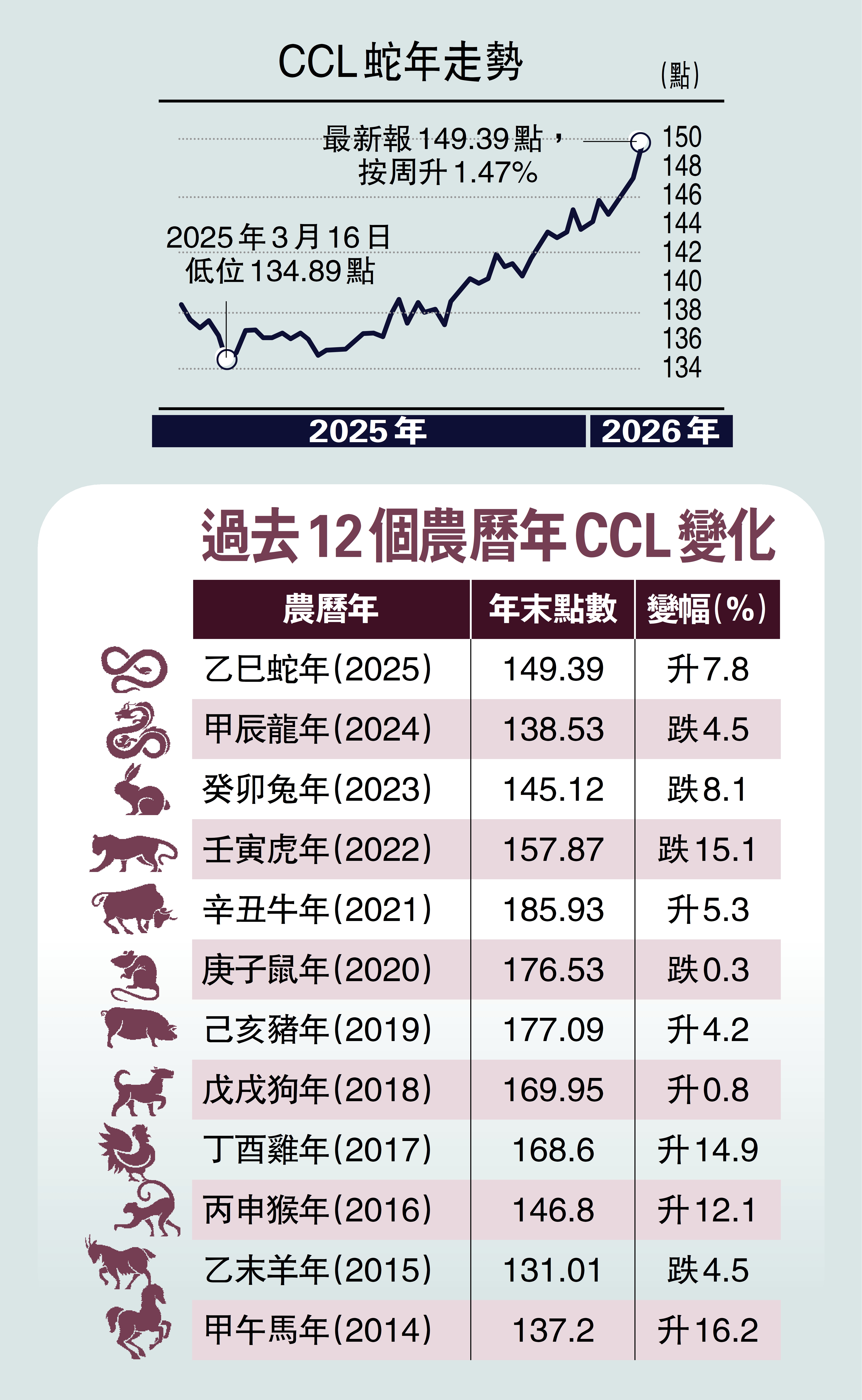楊明儀指出,受惠於銀行兩度減息,2025年「乙巳」蛇年最後一周公布的CCL報149.39點,與「甲辰」龍年最後一周的138.53點相比,蛇年全年樓價上升7.8%,升幅是2017年「丁酉」雞年後8個農曆年以來最大。樓價扭轉過去3個農曆年的跌勢,即2024年「甲辰」龍年跌4.5%,2023年「癸卯」兔年跌8.1%,以及2022年「壬寅」虎年跌15.1%。展望2026年「丙午」馬年,樓價將穩步上升,預測升幅或達一成以上。