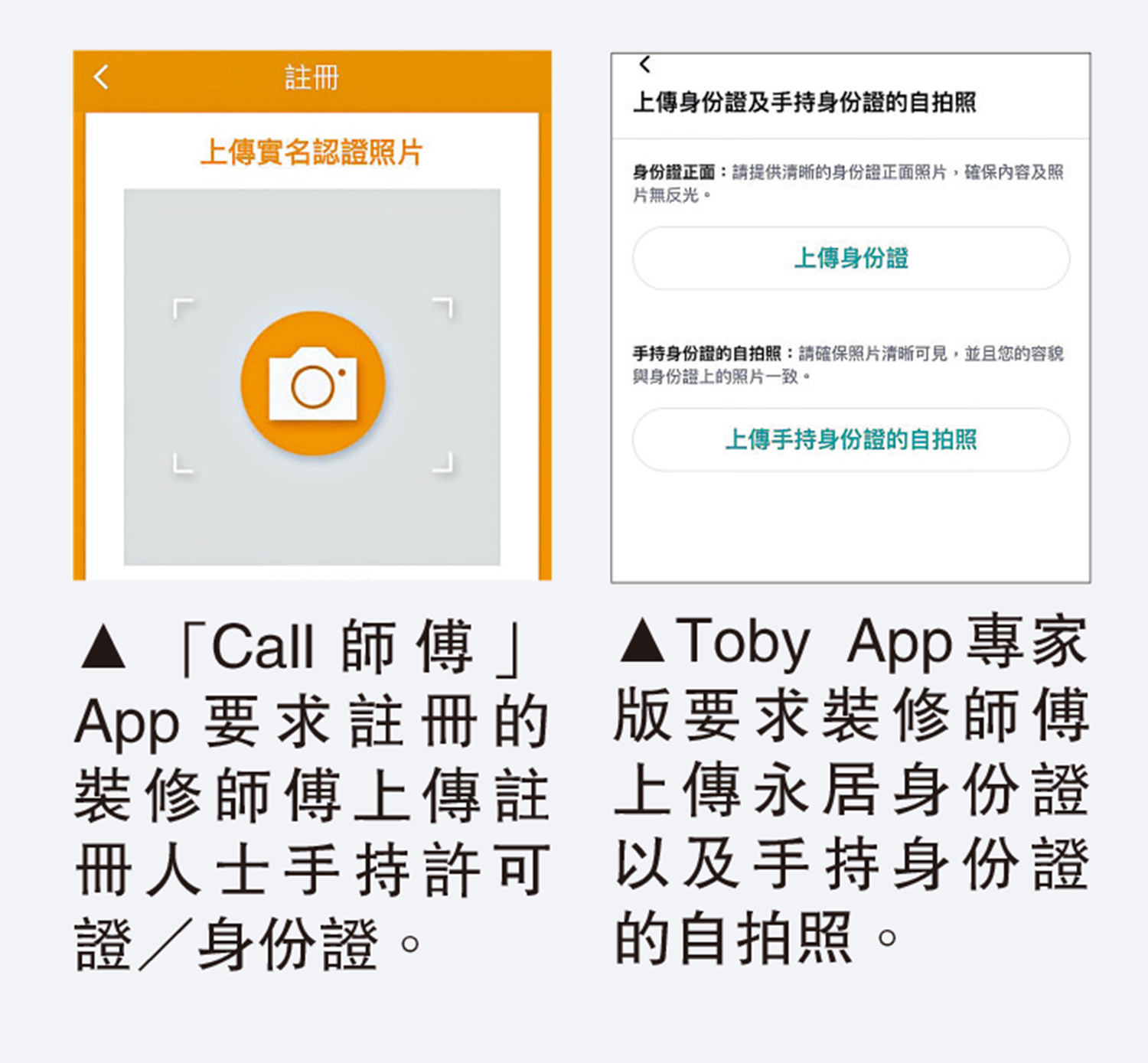 兩個手機應用程式均可以通過個人或公司名義註冊賬戶。大公報記者先下載Call師傅,該手機應用程式要求註冊人士,除了填寫電郵、電話等基本信息外,還要求上傳註冊人士手持許可證/身份證,以及一張寫有「僅用於Call師傅賬戶認證」的紙條,以及上傳其他證件或執照。