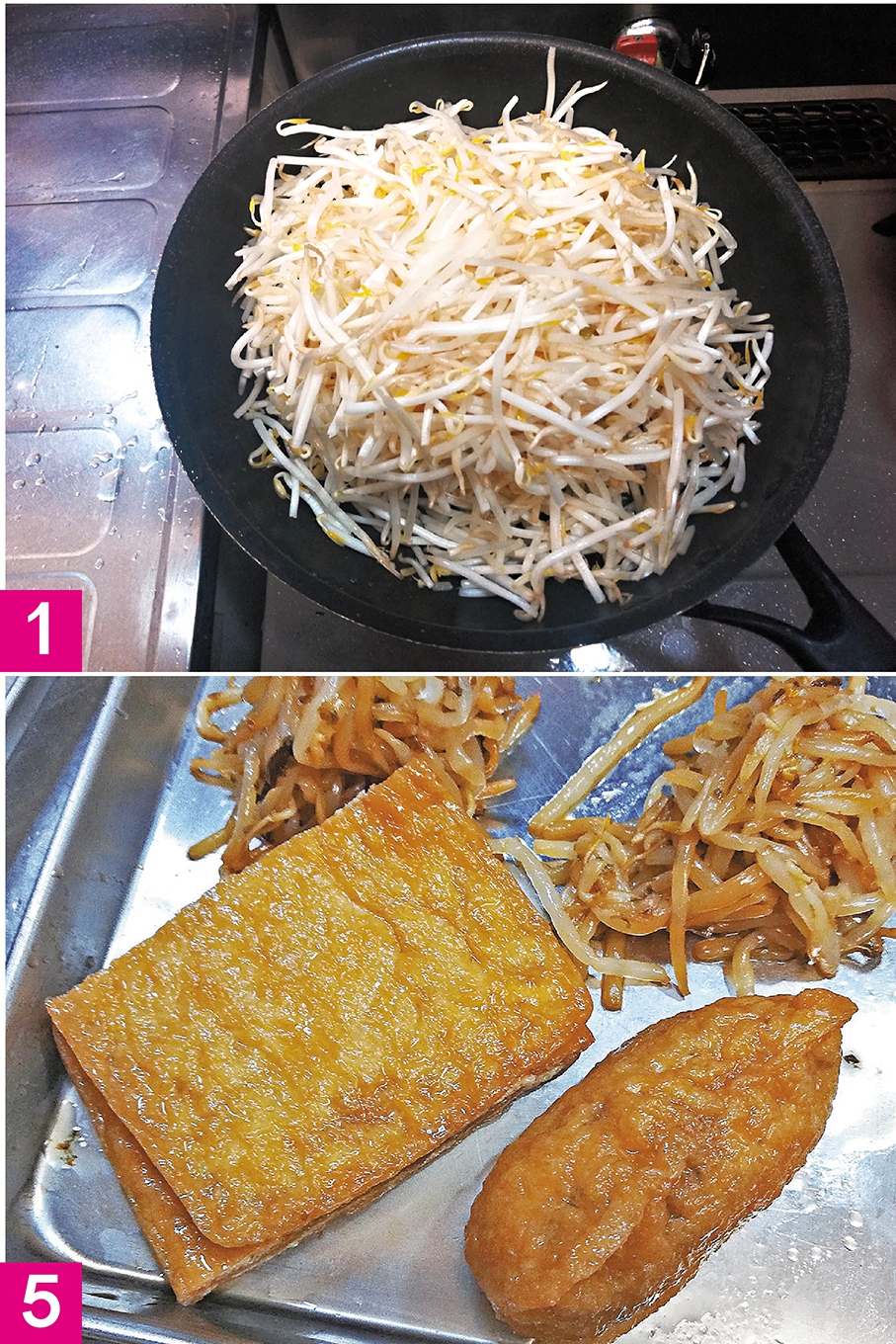 5. 取1小份的綠豆芽,塞入1片稻荷腐皮內,餘下材料同樣做法,做妥10顆綠豆芽稻荷即成。