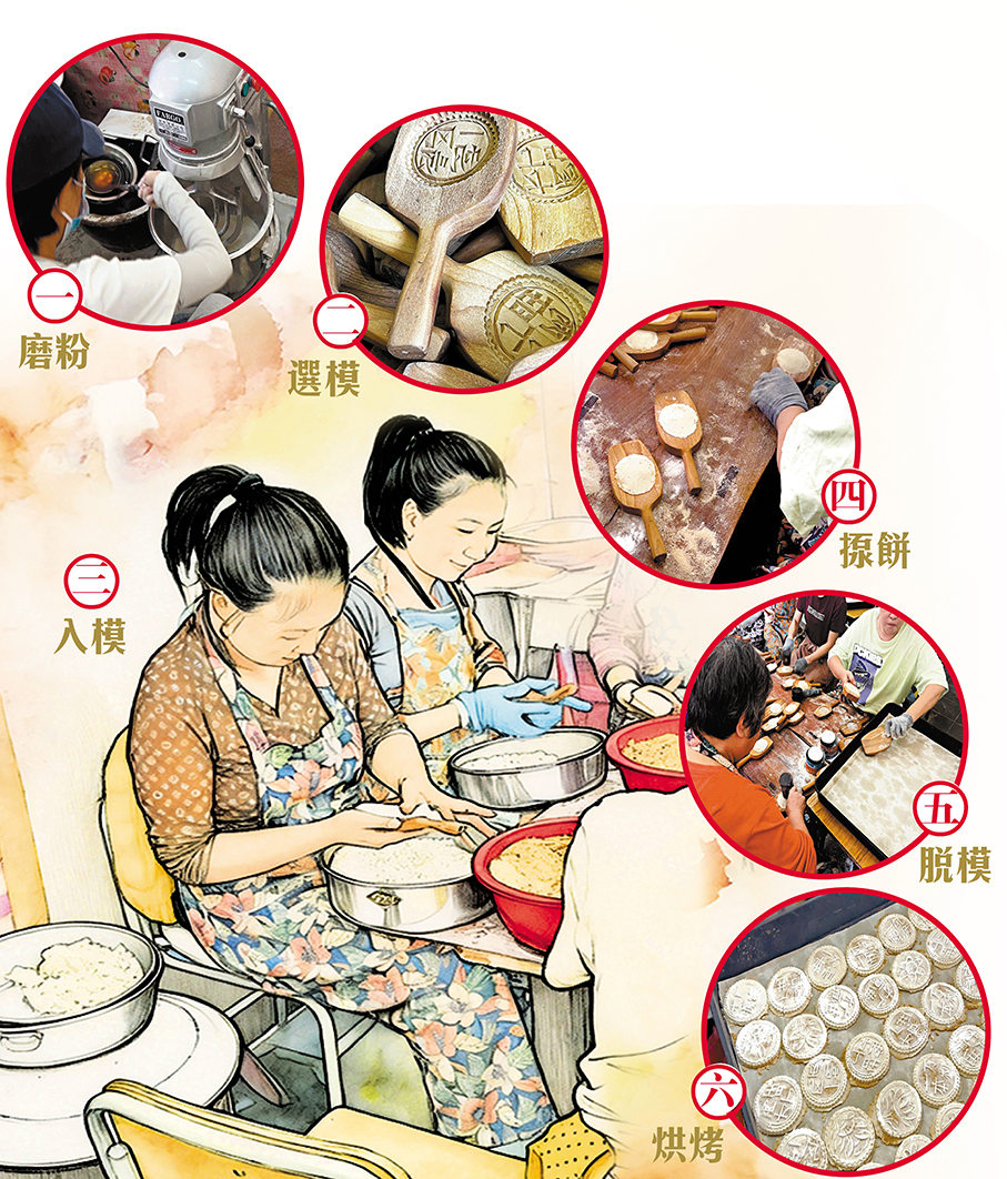 小小一個炒米餅,承載着過去人們對於豐收的喜悅和對來年的期盼,其製作原料大多是過去圍村中最常見的農作物如米、花生,模具亦有許多款式,印有不同紋樣,大多是些祝福、吉利的詞語,如「財源廣進」、「一帆風順」等,偶爾還會有些不同花樣做點綴。