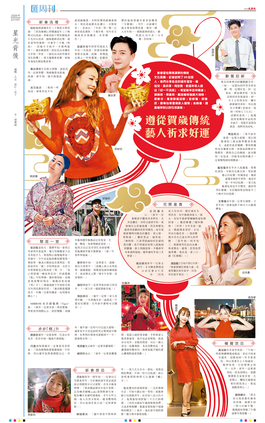 新春習俗展現濃厚的傳統文化氛圍,記者訪問了25位藝人,他們分享各自的過年習俗。容祖兒、黃宗澤、周吉佩、敖嘉年等人遵從「初一不洗頭」,寄望新年吉祥順遂;張與辰、傅嘉莉、戴祖儀等強調大掃除、穿新衣,寓意辭舊迎新;衛詩雅、邱傲然、鄭希怡等重視家人團聚;佘詩曼、譚嘉儀等則以鮮花添喜氣。