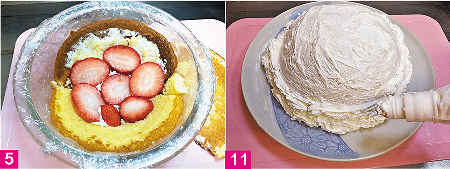 4. 將2片半圓形海綿蛋糕置入已鋪上保鮮紙的大碗內,用小刀切出重疊的海綿蛋糕,整理成半球形的底部;