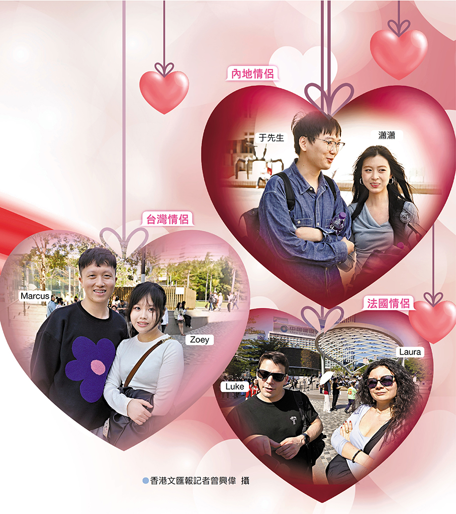 今年情人節適逢年廿七,香港街頭既可見親朋成群歡聚,更不乏情侶結伴過節,一對對情人手捧鮮花、肩挽禮品,走過愛心裝置與各式節日擺設,成為城市間一道浪漫醉人的風景線。香港文匯報記者昨日在尖沙咀海旁直擊,發現原來不少旅客都選擇於香港度過這個浪漫假日,有台灣情侶早已預訂情人節套餐以饗味蕾,也有內地旅人攜伴探索城市一隅,記錄屬於二人的甜蜜戀曲。無論形式如何,天下有情人紛紛以自己的方式表達愛意,為節日添上暖心一筆。●文︰香港文匯報記者 李千尋