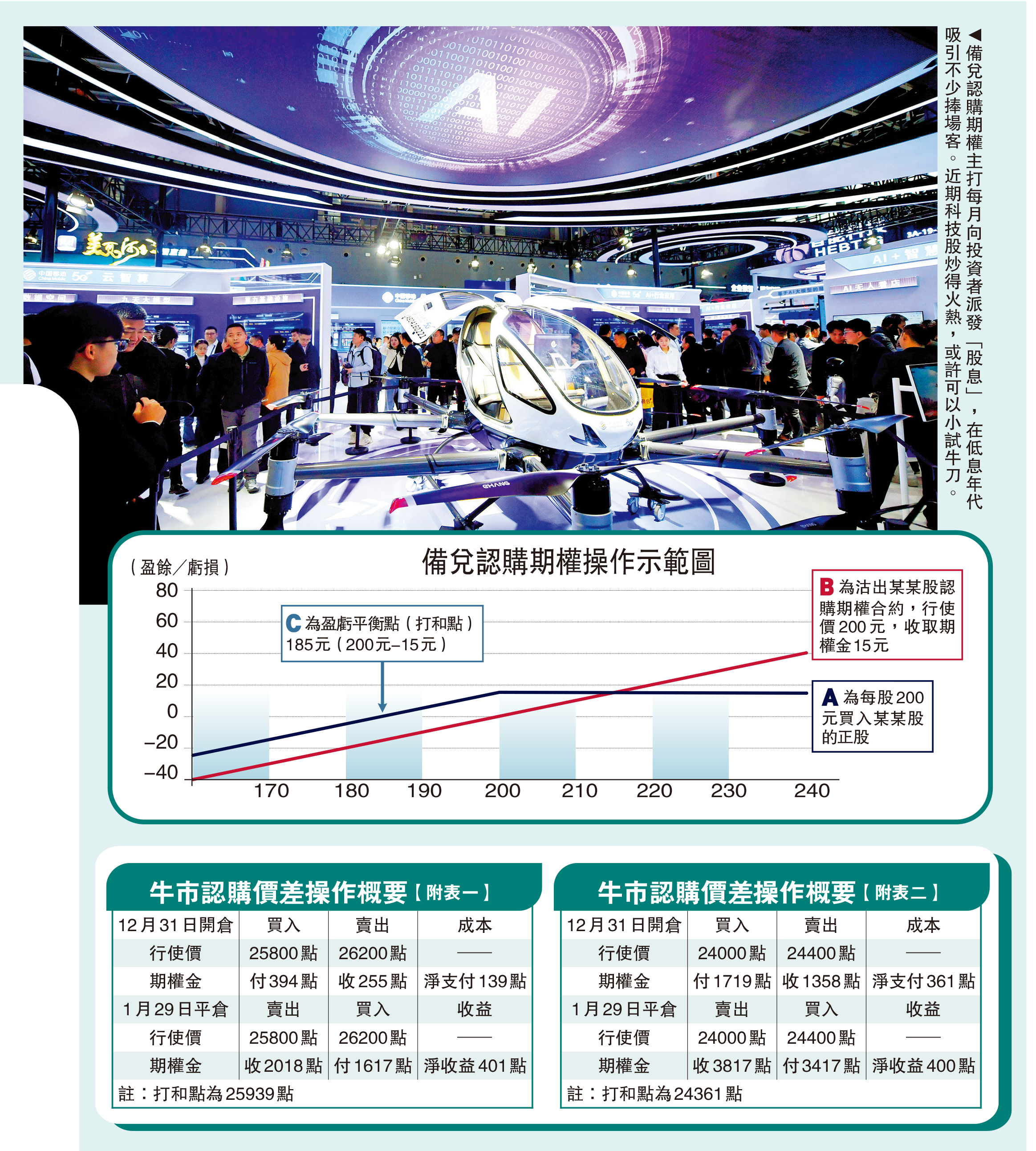 倘若投資者A使用深度價內期權的合約的結果如何呢?(見附表二)2025年12月31日買入1月份到期合約,行使價24000點期權合約,支付1719點;賣出行使價24400點合約,收取1358點;淨支付361點(1719-1358)。組合打和點24361點(24000+361)。換言之,除非大市回吐超過1269點,組合才會出現虧損。