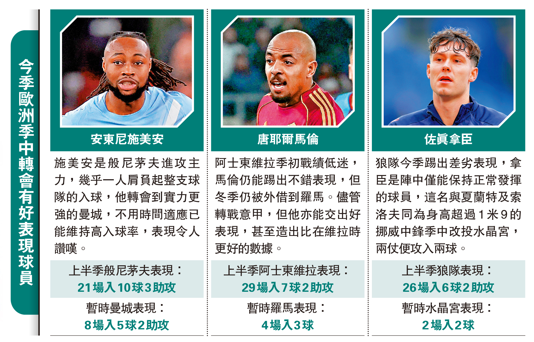 狼隊今季踢出差劣表現,拿臣是陣中僅能保持正常發揮的球員,這名與夏蘭特及索洛夫同為身高超過1米9的挪威中鋒季中改投水晶宮,兩仗便攻入兩球。