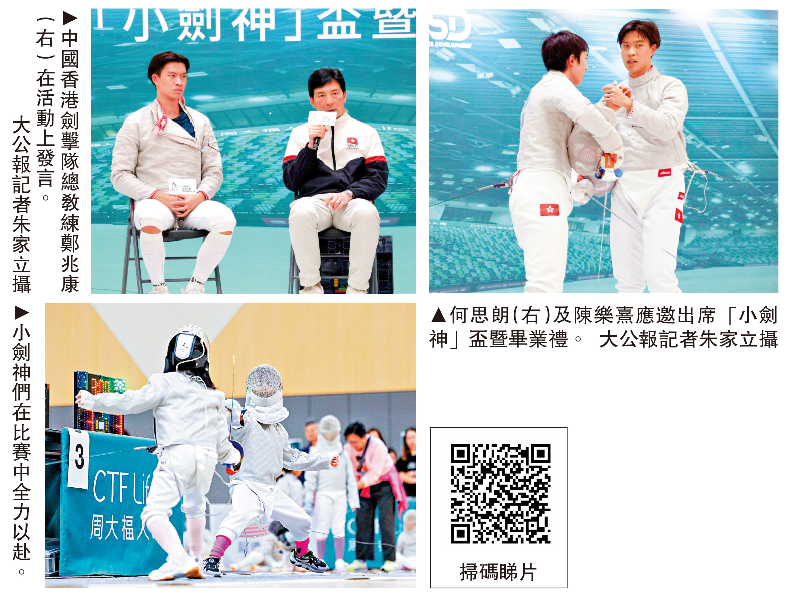 【大公報訊】記者朱家立報道:「小劍神」培訓計劃14日在啟德體藝館舉行「小劍神」盃暨畢業禮,中國香港劍擊隊總教練鄭兆康、中國香港佩劍手何思朗及陳樂熹應邀出席活動。鄭兆康坦言,港隊目前已在個人賽取得大滿貫成就,期待今年能在團體賽取得更多突破成績。