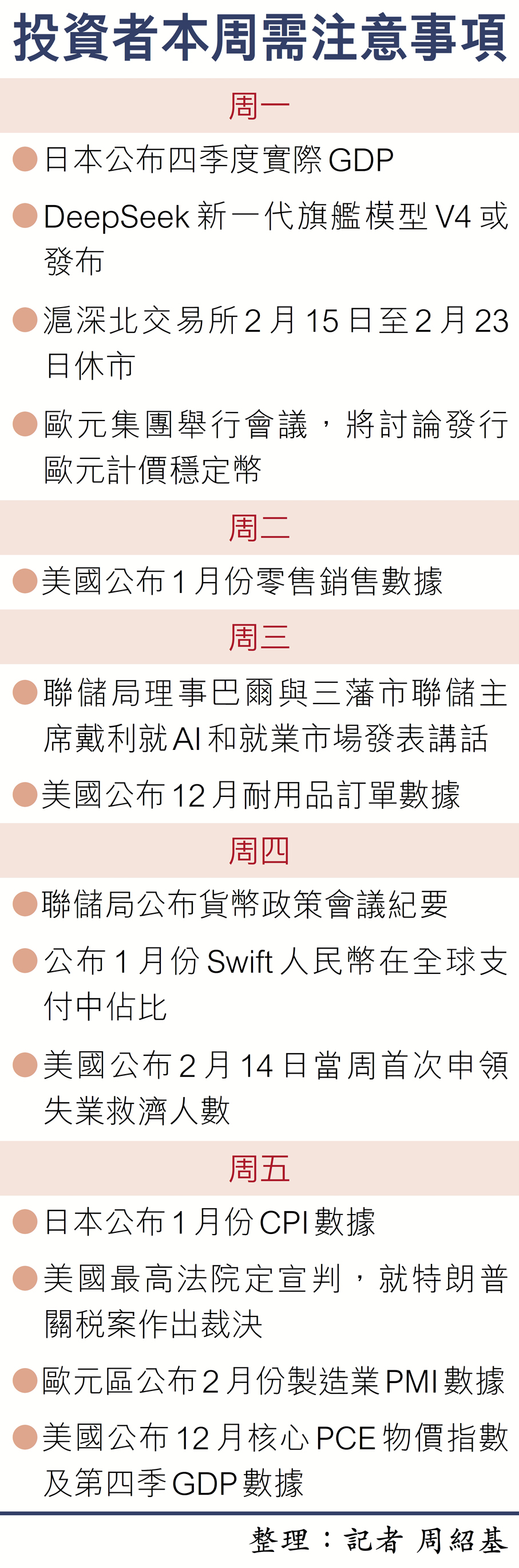香港文匯報訊(記者 周紹基)踏入春節假期,港股本周只有一天半市,A股更要至下周二(年初八)才復市。本周值得留意的是,聯儲局有兩位官員將於本周就AI及當地就業市場發表言論,以及公布貨幣政策會議紀要。另外,美國及日本將在今周公布其GDP數據,美國最高法院也會於本周五就「特朗普關稅案」作出裁決。