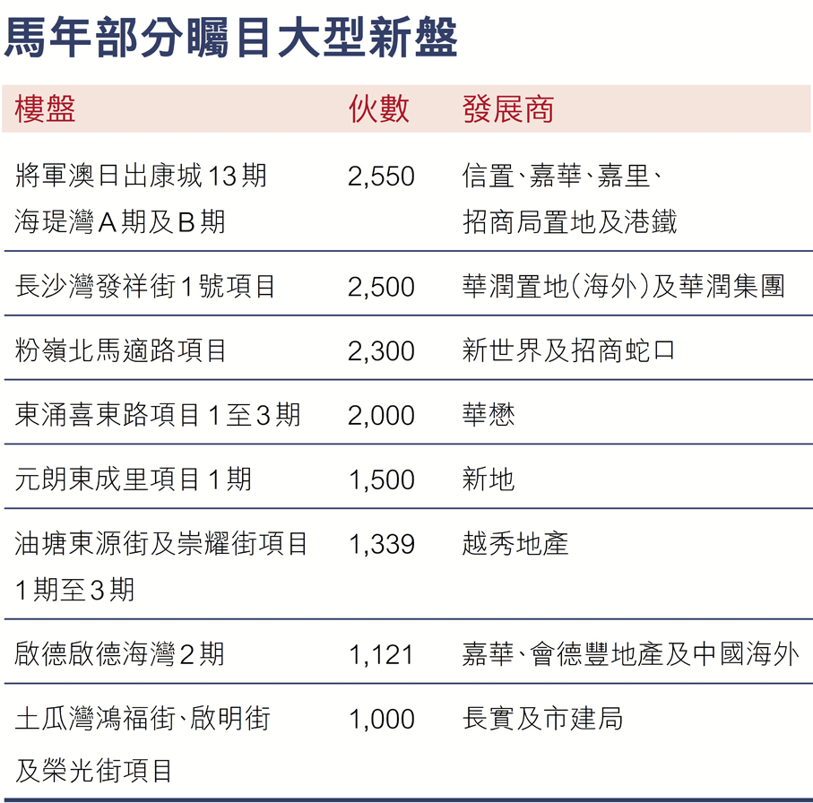 2026丙午馬年是九運的第三年,上承乙巳蛇年的火氣,下接丁未羊年,是為「赤馬紅羊」,火氣比去年更旺,亦是九運中火氣最強盛的一年。五行中「火能生土」,相信今年將大利屬土的房地產行業。事實上,去年發展商已陸續加快推盤,截至今年1月底待批預售樓花同意書的住宅項目達26個,涉及8,195伙。據香港文匯報統計,馬年全港至少有87個全新盤有機會登場,合共潛在供應達31,736伙。香港地產建設商會執行委員會主席梁志堅向香港文匯報表示,馬年本港經濟及樓市將持續向好,發展商將更積極投地,新盤開價亦更加進取,全年樓價有望升5%至10%。
