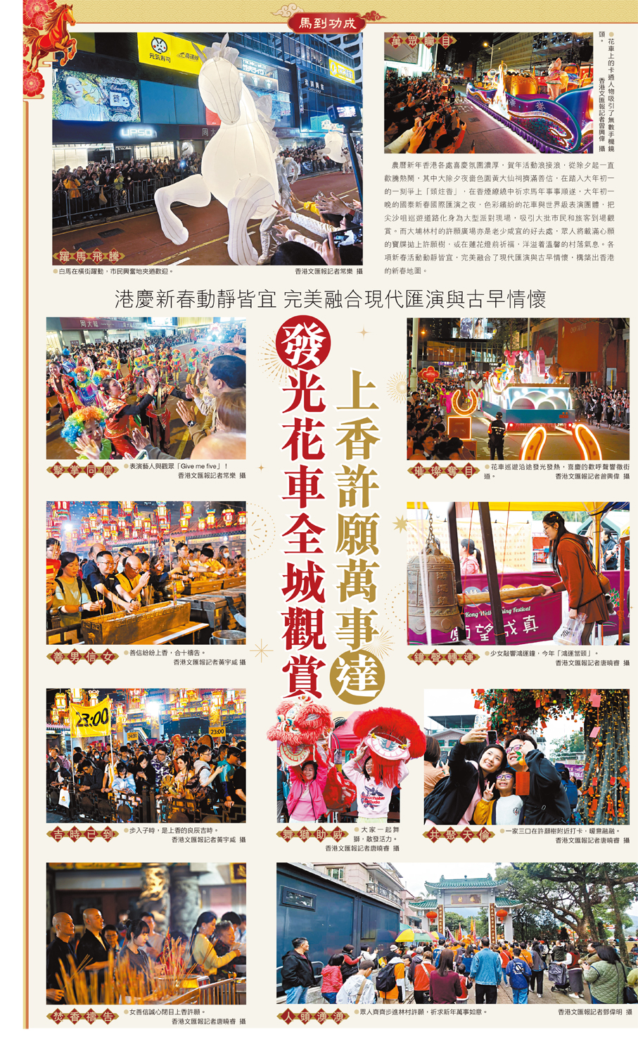 農曆新年香港各處喜慶氛圍濃厚,賀年活動浪接浪,從除夕起一直歡騰熱鬧,其中大除夕夜嗇色園黃大仙祠擠滿善信,在踏入大年初一的一刻爭上「頭炷香」,在香煙繚繞中祈求馬年事事順遂,大年初一晚的國泰新春國際匯演之夜,色彩繽紛的花車與世界級表演團體,把尖沙咀巡遊道路化身為大型派對現場,吸引大批巿民和旅客到場觀賞。而大埔林村的許願廣場亦是老少咸宜的好去處,眾人將載滿心願的寶牒拋上許願樹,或在蓮花燈前祈福,洋溢着溫馨的村落氣息。各項新春活動動靜皆宜,完美融合了現代匯演與古早情懷,構築出香港的新春地圖。