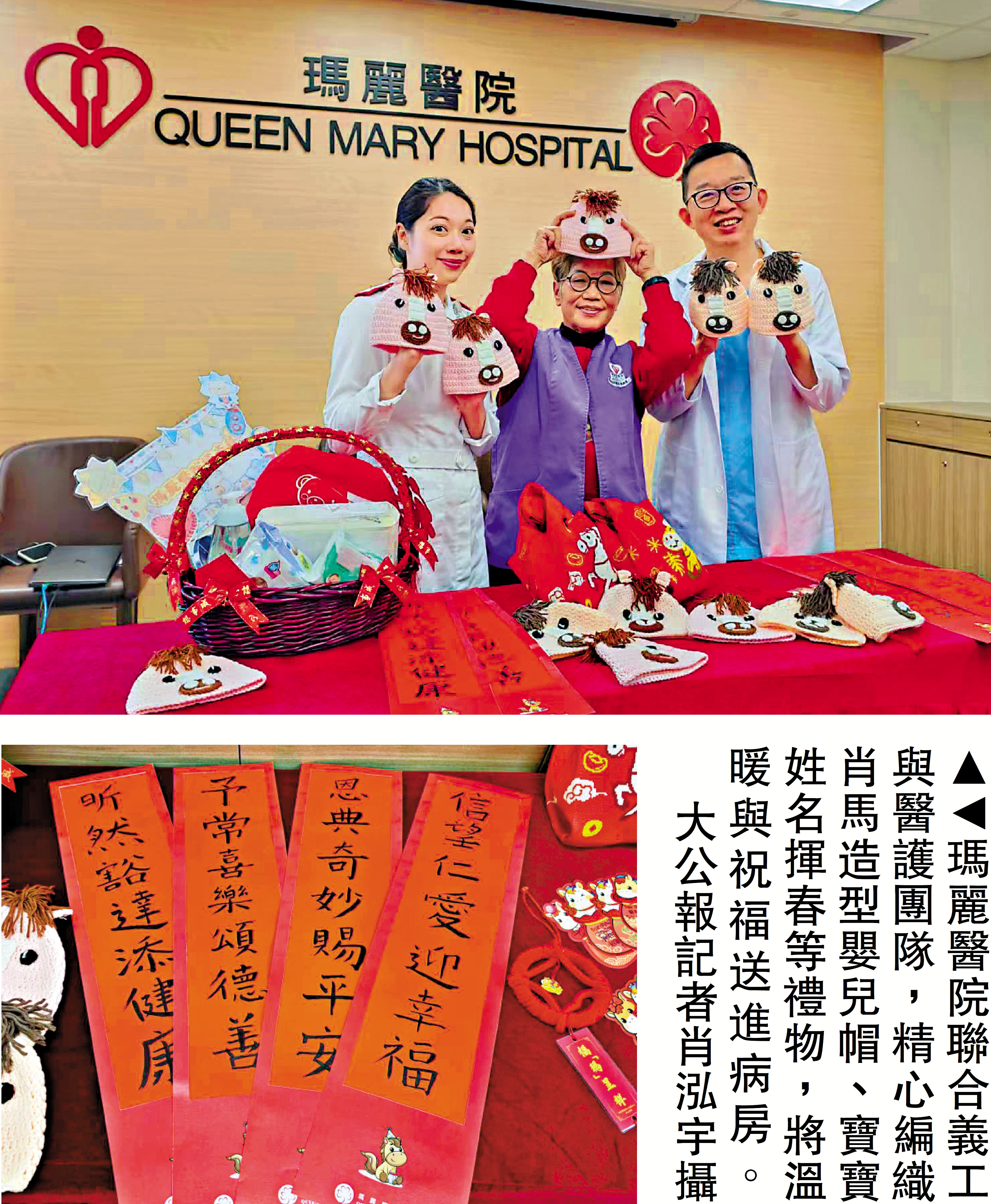 【大公報訊】記者肖泓宇報道:馬年新春,瑪麗醫院的新生兒病房洋溢着濃濃年味。對於新年期間仍需留院的新生寶寶,醫院聯合義工與醫護團隊,精心打造肖馬造型編織嬰兒帽、寶寶姓名專屬揮春等充滿心意的新年禮物,將溫暖與祝福送進病房。一針一線的編織、一字一句的撰寫,讓留院的小寶寶們雖未能在家過年,卻能感受滿滿的新春暖意,以及來自醫院的溫柔守護。