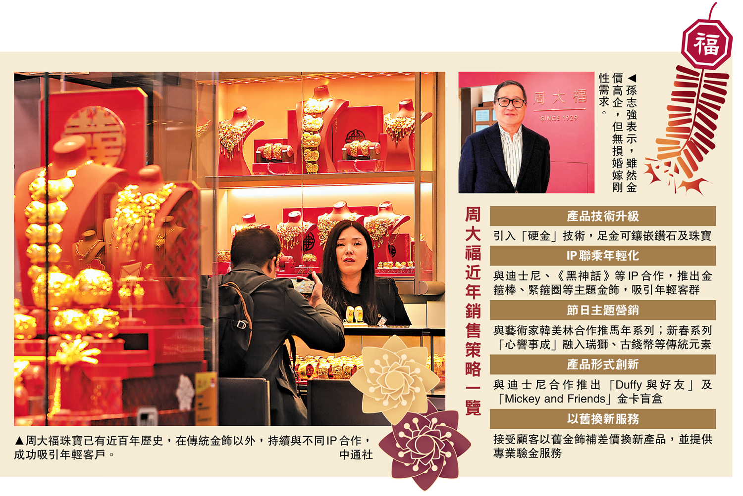 周大福珠寶已有近百年歷史,孫志強認為集團仍充滿活力,在傳統金飾以外,持續與不同IP合作,成功吸引年輕客戶。除了與迪士尼長期合作,集團更與熱門遊戲《黑神話》跨界聯乘,推出以金箍棒、緊箍圈為靈感的金飾,成功吸納男性顧客,去年在內地零售值已超過2.6億元人民幣,成績亮眼。