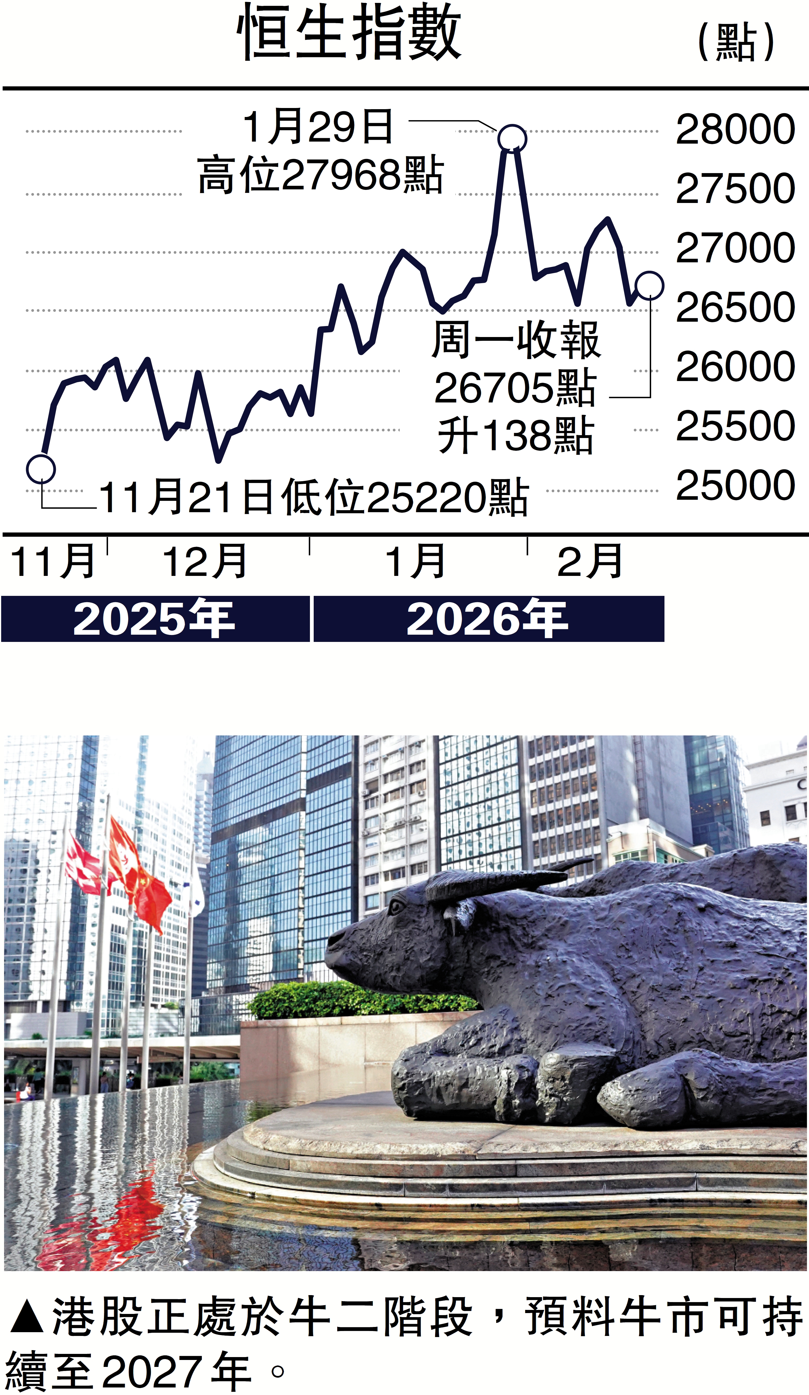 馬年伊始,祝各位讀者馬到功成、財源廣進!在這個充滿活力與機遇的丙午之年,期望港股可以開行馬力,表現強勁,而我整體對馬年股市仍持正面樂觀態度。港股正處牛二階段,延續自2024年起的向上格局,預計牛市有望持續至2027年。
