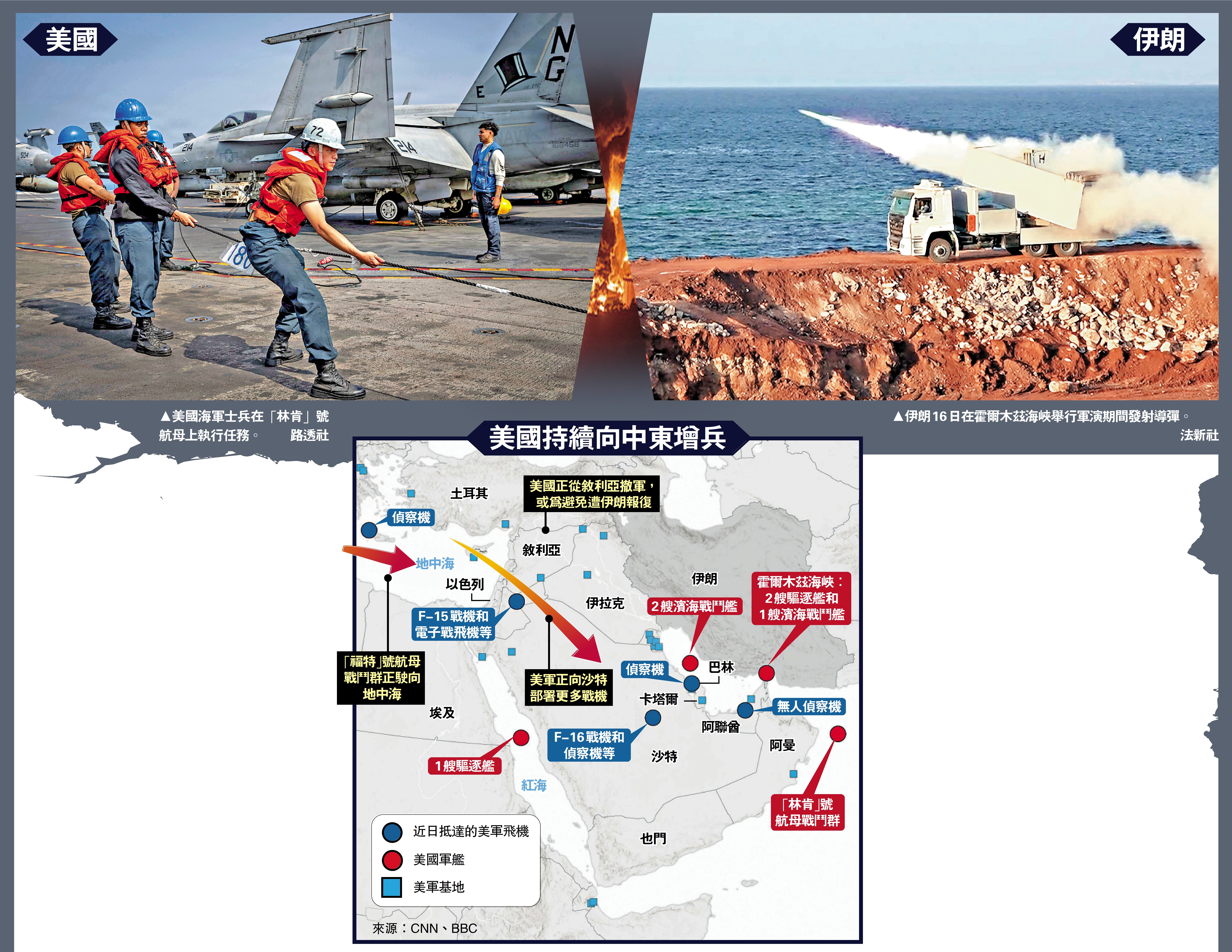 美軍近日持續向伊朗附近增兵,繼「林肯」號航母戰鬥群之後,「福特」號航母戰鬥群也駛向中東。18日,「福特」號出現在摩洛哥附近海域,全速駛向連接大西洋與地中海的直布羅陀海峽,預計將在3至5天內抵達地中海東部。與此同時,美軍將數十架F-35、F-22和F16戰機調往沙特等中東國家。軍事專家指出,美軍近日的動向讓人聯想到去年6月美國空襲伊朗核設施前的準備工作。